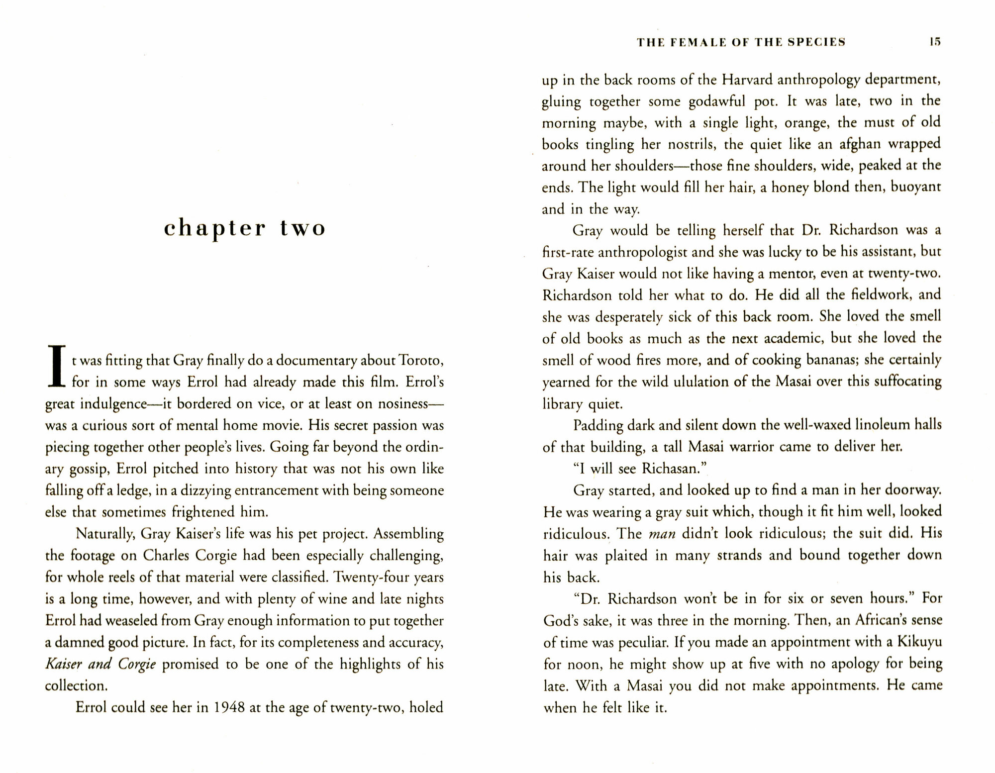 Still unattached and childless at fifty-nine, world-renowned anthropologist Gray Kaiser is seemingly invincible-and untouchable. Returning to make a documentary at the site of her first great triumph in Kenya, she is accompanied by her faithful middle-aged assistant, Errol McEchern, who has loved her for years in silence.