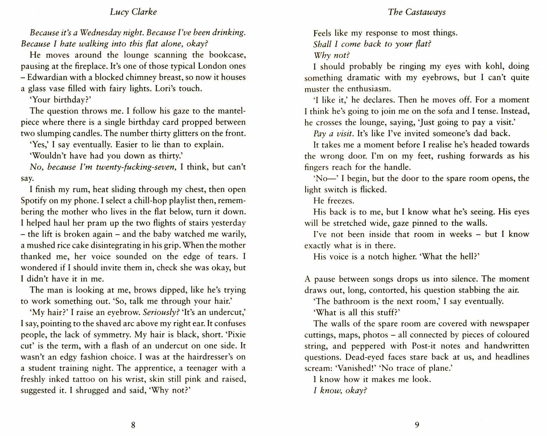 Потрясающее чтение! С первой страницы и до конца - невозможно оторваться, пришлось жертвовать сном) Лори забронировала отпуск для себя и своей сестры Эрин на Фиджи, но накануне вылета они поссорились, и Лори осталась на самолете одна. Самолет исчез без следа, оставив бедную Эрин гадать, что же случилось с ней и ее сестрой. Теперь как репортер она пытается выяснить правду. Книга переключается между повами Лори и Эрин, между прошлым и настоящим, показывая нам неожиданные факты. Развязка тоже не разочаровала.