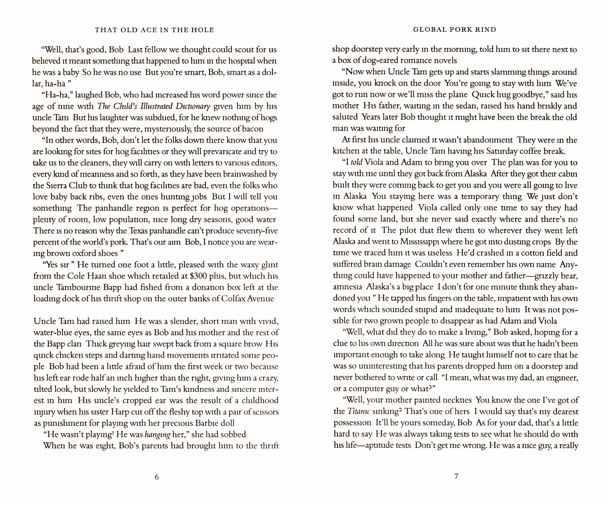 Some folks in the Texas panhandle do not like hog farms. But Bob Dollar, the newly hired hog site scout for Global Pork Rind, intends to do his job. Bob must contend with tough men and women like ancient Freda Beautyrooms, who controls a ranch he covets, and Ace Crouch, the windmiller who defies the hog farms. As Bob settles in at La Von Fronk’s bunkhouse and lends a hand at Cy Frease’s Old Dog Cafe, he is forced to question everything.