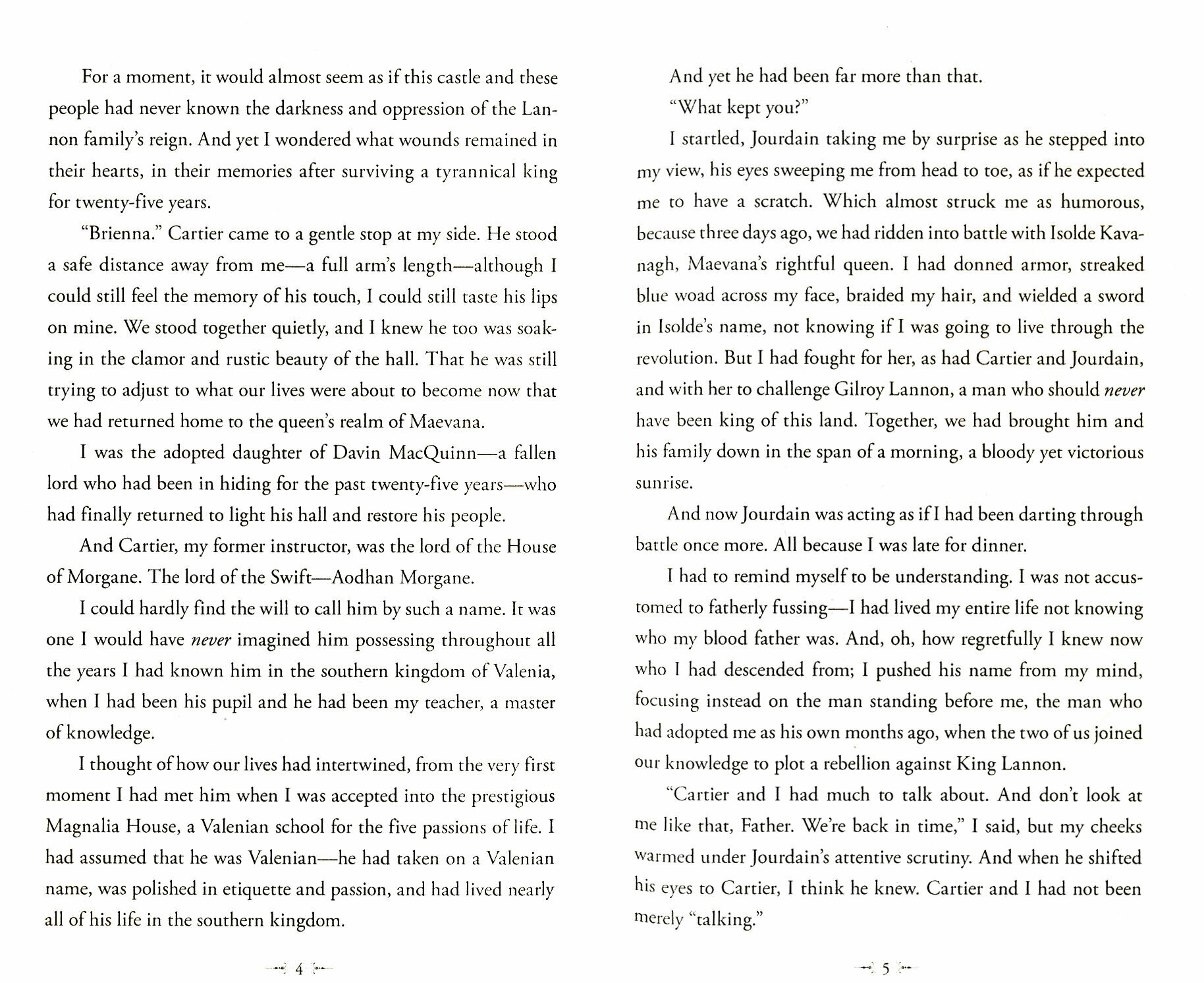 Finally, Brienna is a mistress of knowledge and is settling into her role as the daughter of Davin MacQuinn, a disgraced lord who returned to Maevana to reclaim his house. Though she's just survived a revolution, one that will finally return a queen to the throne, she faces another difficult challenge. She must prove herself trustworthy to the MacQuinns. But as Queen Isolde Kavanagh's closest confidant, she'll have to balance serving her father's house as well as her country. And then there's Cartier Evariste, a wholly separate factor in her new life.