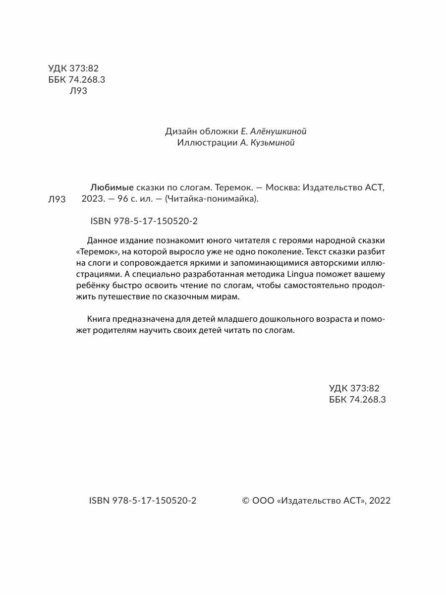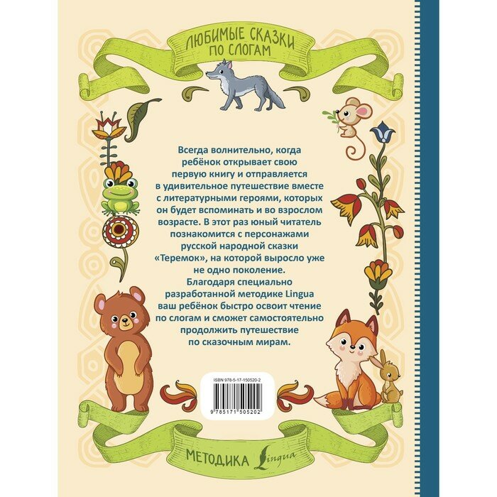 Данное издание познакомит юного читателя с героями народной сказки «Теремок», на которой выросло уже не одно поколение. Текст сказки разбит на слоги и сопровождается яркими и запоминающимися авторскими иллюстрациями. А специально разработанная методика Lingua поможет вашему ребёнку быстро освоить чтение по слогам, чтобы самостоятельно продолжить путешествие по сказочным мирам.
