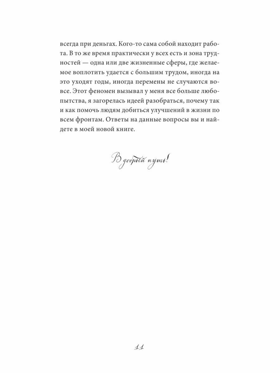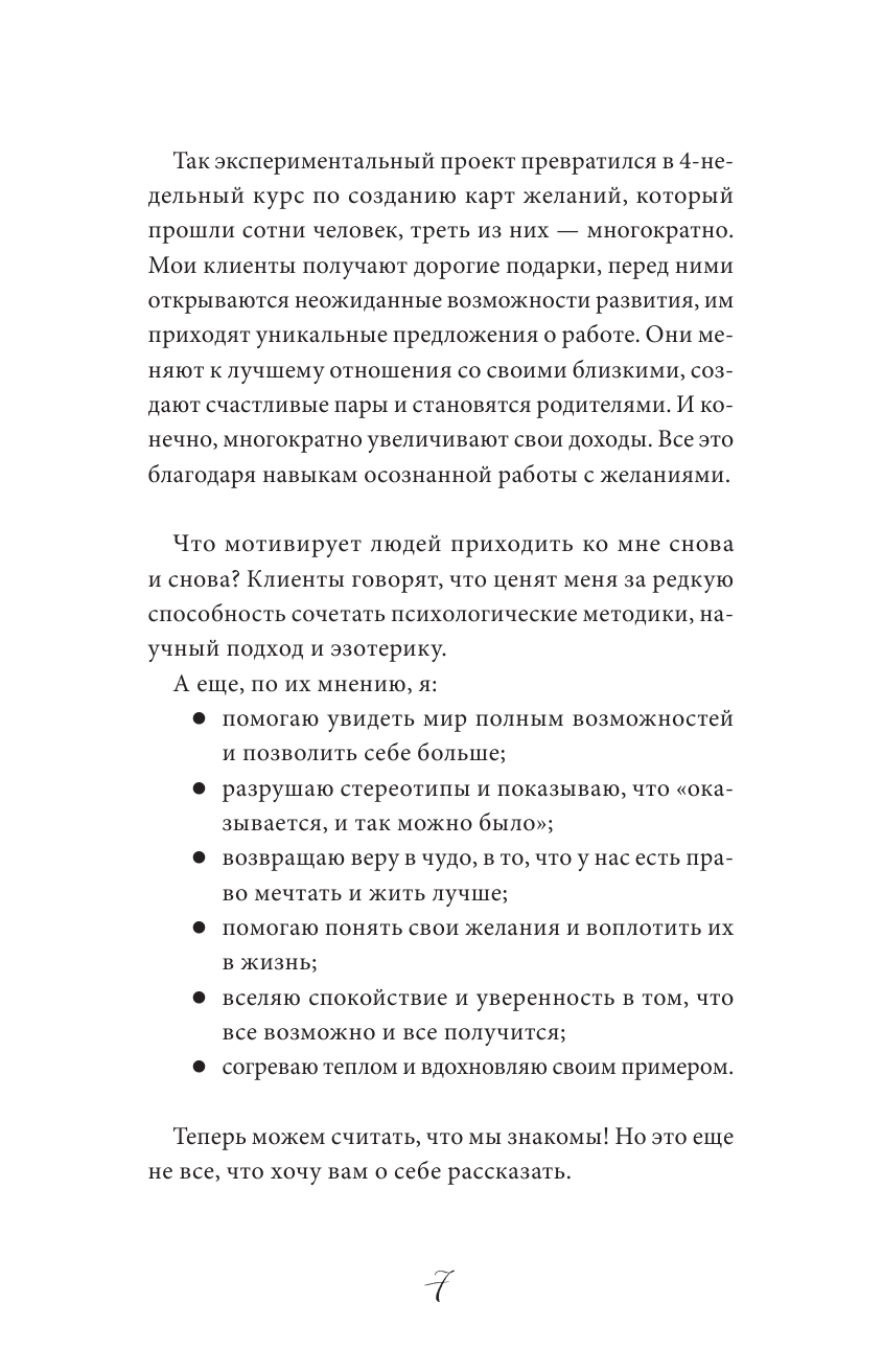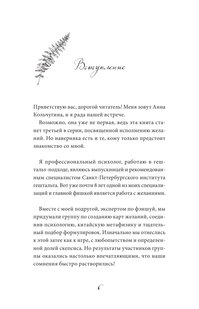 Все три книги Анны Кольчугиной пополнили мою библиотеку. Убедилась,что важно загадывать желания правильно, а это не так то просто. Узнала причины почему они могут не исполняться. Что мне очень понравилось,так это момент,что если в книге идёт упоминание о темах или практиках из прошлых книг,то даётся точное указание главы,раздела,страницы. Написано доступно,понятно и интересно. Если хочешь,чтоб твои желания сбывались,рекомендую к прочтению.
