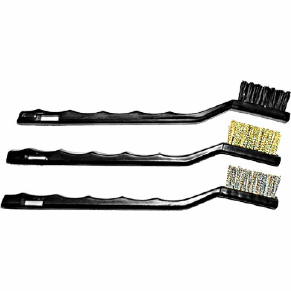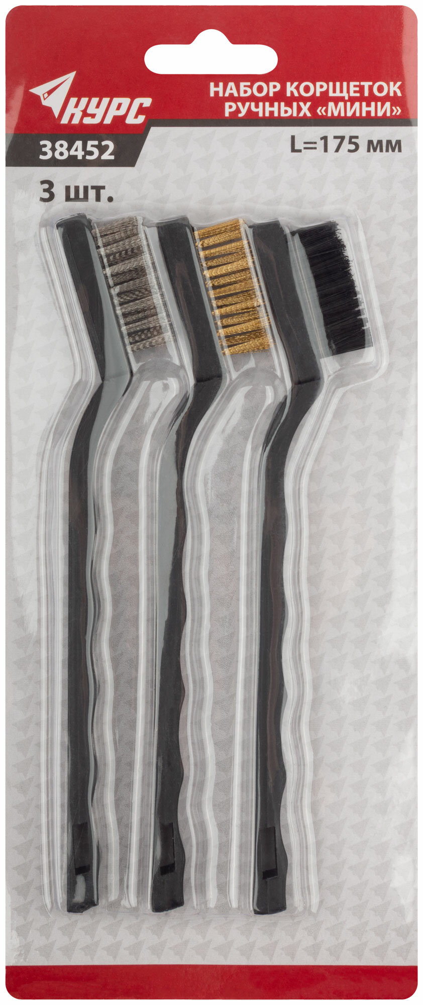 Набор ручных корщеток предназначен для очистки поверхностей узлов и агрегатов, элементов крепежа, деталей механизмов и кузовов автомобилей от старой краски, загрязнений и коррозии. В составе набора три щётки со стальной, латунной и пластиковой щетиной для грубой или аккуратной очистки. Зачистные щётки имеют пластиковые рукоятки. Чаще всего используются для очистки узлов и деталей при ремонте автомобилей, на производстве, а также в домашнем хозяйстве.