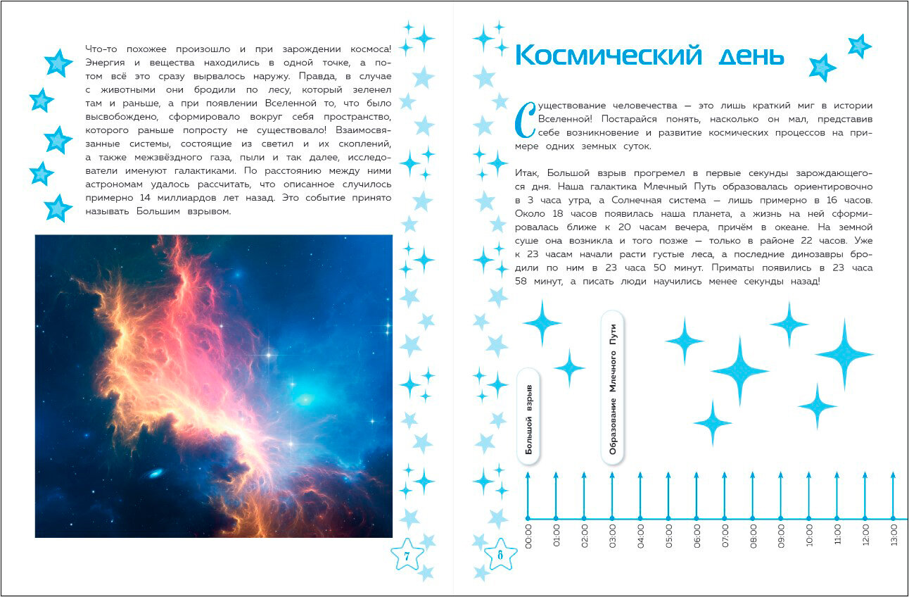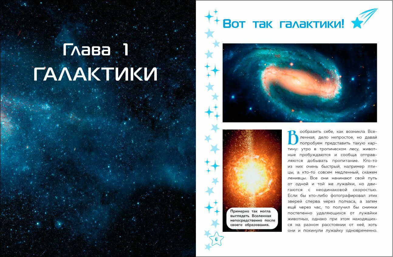 Внимание! Если хочешь узнать всё самое захватывающее о нашей Вселенной, скорее открывай эту книгу! Будет интересно! На Земле ты полюбуешься полярными сияниями, понаблюдаешь за метеорными потоками и метеоритными дождями, увидишь величественные солнечные и лунные затмения. Затем - посетишь Меркурий, Марс, Венеру и другие планеты Солнечной системы! А выйдя за её пределы, ты отправишься к звёздам, станешь свидетелем загадочных процессов их рождения и угасания, увидишь, что находится внутри чёрных дыр, а благодаря Туманности Ориона даже заглянешь в прошлое! Ты пронесёшься по Млечному Пути и доберёшься не только до соседних галактик, но и до центра скопления Девы, а ещё - понаблюдаешь за слияниями космических систем!
