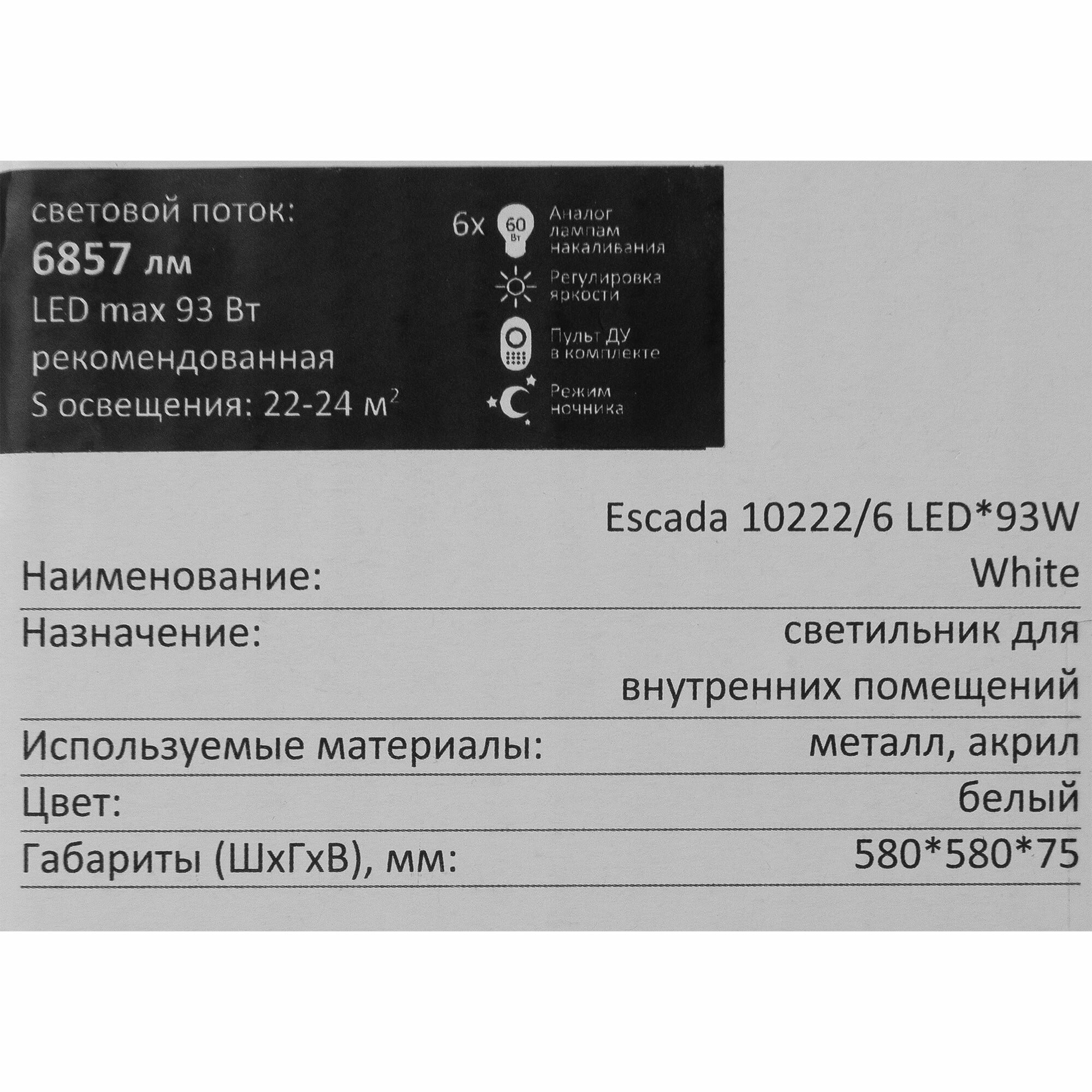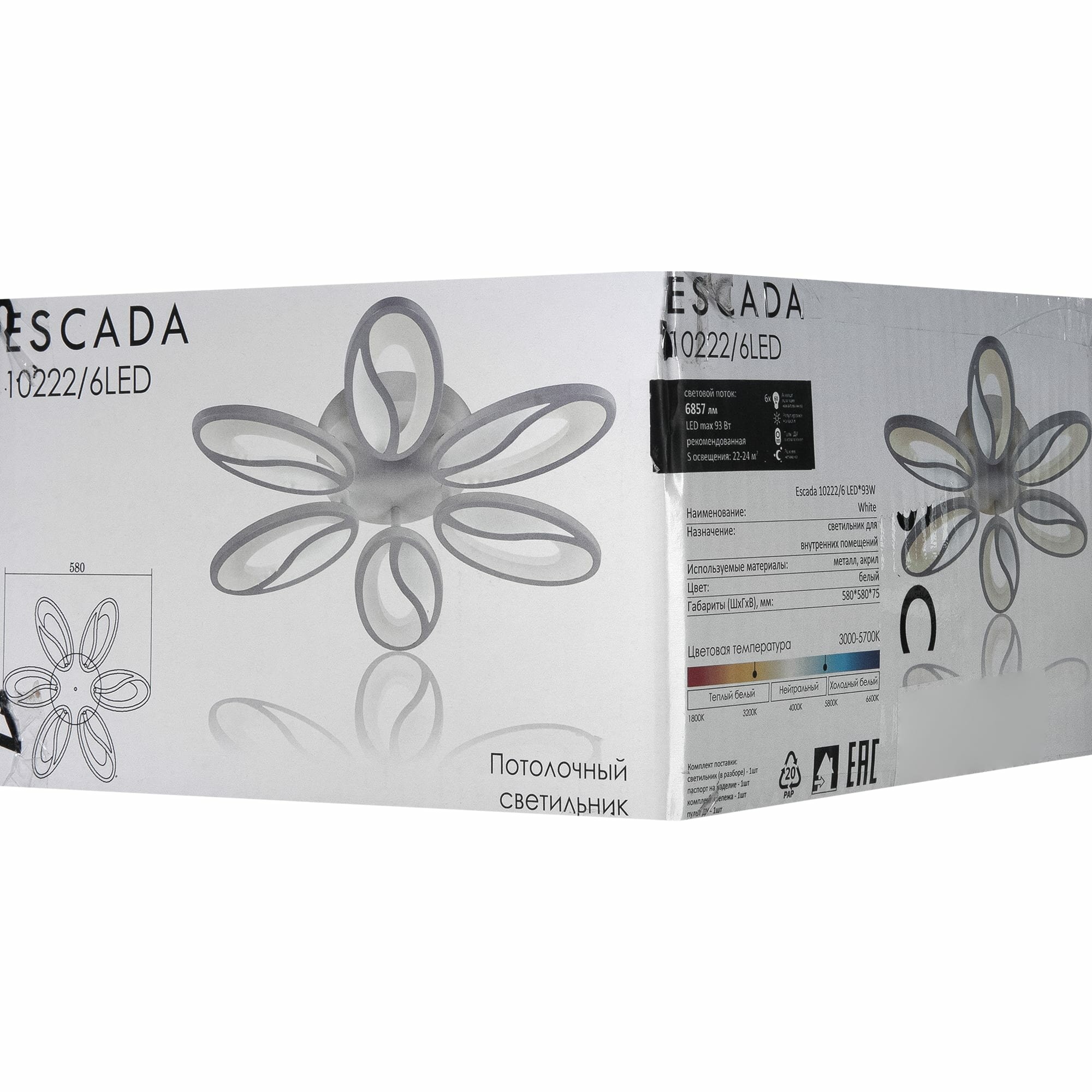 Потолочная люстра Escada 10222/6LED 93W серии GRAIN. Будет хорошим решением для квартиры. Размеры 58x58x7.5 cm. Параметры пылевлагозащиты IP — 20. Форма овальная. Плафон металлический белого цвета, а материал/цвет арматуры металл/белый. Имеются встроенные светодиодные лампы, рассчитанные на весь срок службы светильника. Площадь освещения охватывает 24 m². Идеально подходит для гостиной, для кухни, для спальни, для столовой, для прихожей, для кафе и ресторанов. Вес с упаковкой 2.3 kg