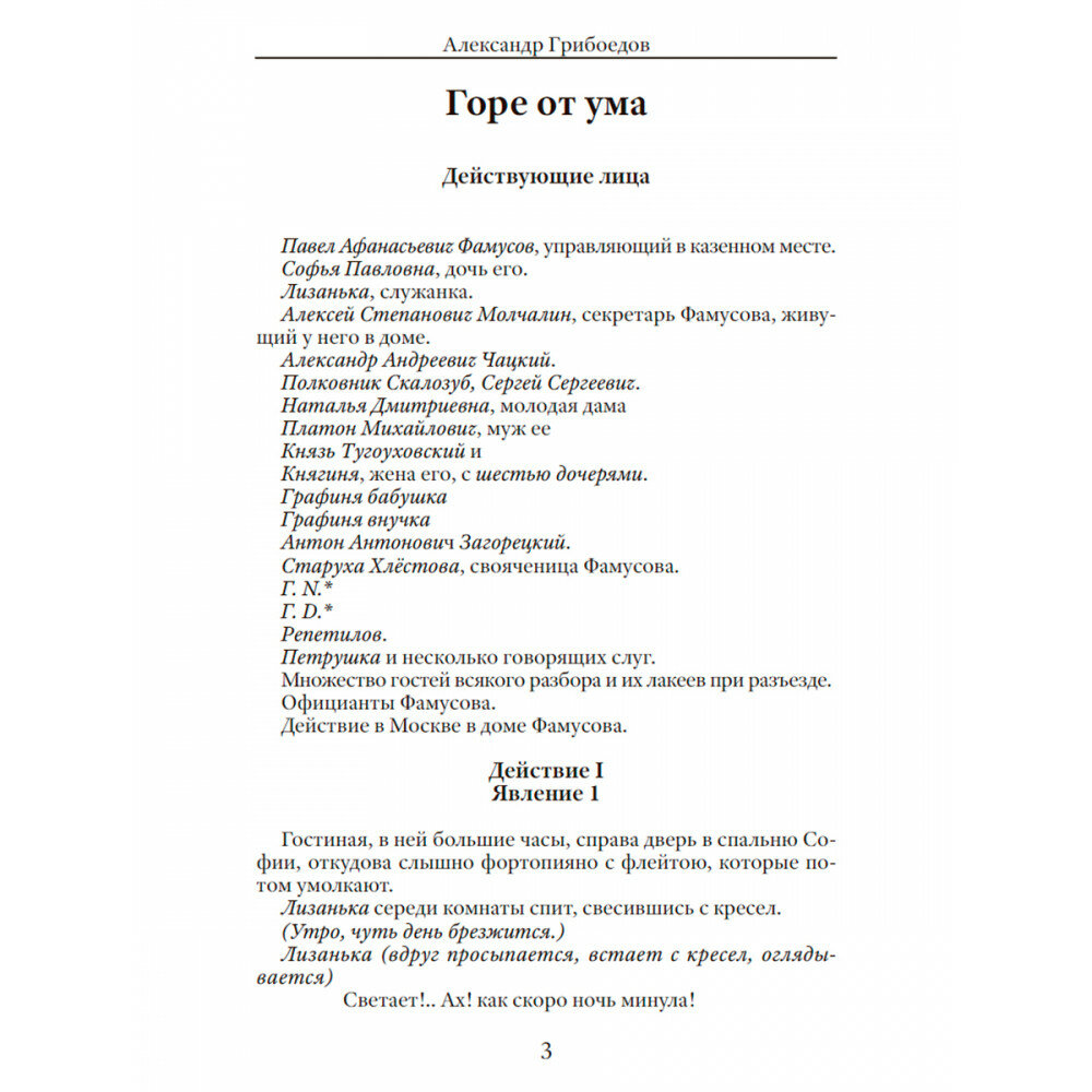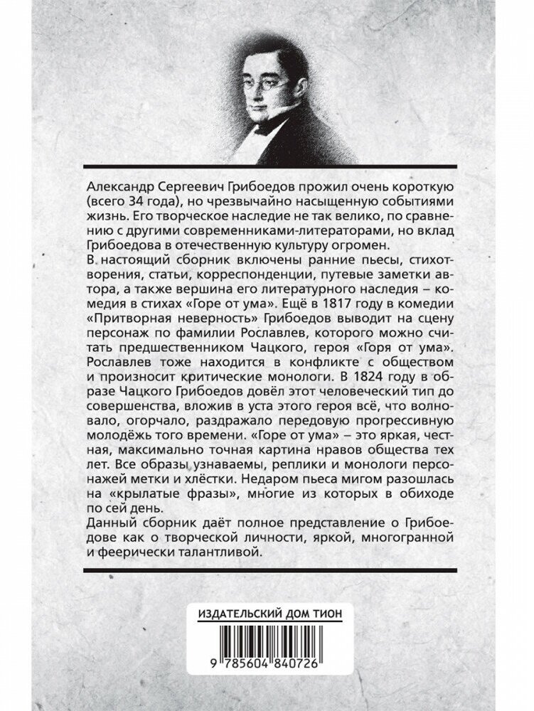 В настоящий сборник включены ранние пьесы, стихотворения, статьи, корреспонденции, путевые заметки автора, а также вершина его литературного наследия – комедия в стихах "Горе от ума". Ещё в 1817 году в комедии "Притворная неверность" Грибоедов выводит на сцену персонаж по фамилии Рославлев, которого можно считать предшественником Чацкого, героя "Горя от ума". Рославлев тоже находится в конфликте с обществом и произносит критические монологи. В 1824 году в образе Чацкого Грибоедов довёл этот человеческий тип до совершенства, вложив в уста этого героя всё, что волновало, огорчало, раздражало передовую прогрессивную молодёжь того времени. "Горе от ума" – это яркая, честная, максимально точная картина нравов общества тех лет. Все образы узнаваемы, реплики и монологи персонажей метки и хлёстки. Недаром пьеса мигом разошлась на "крылатые фразы", многие из которых в обиходе по сей день.