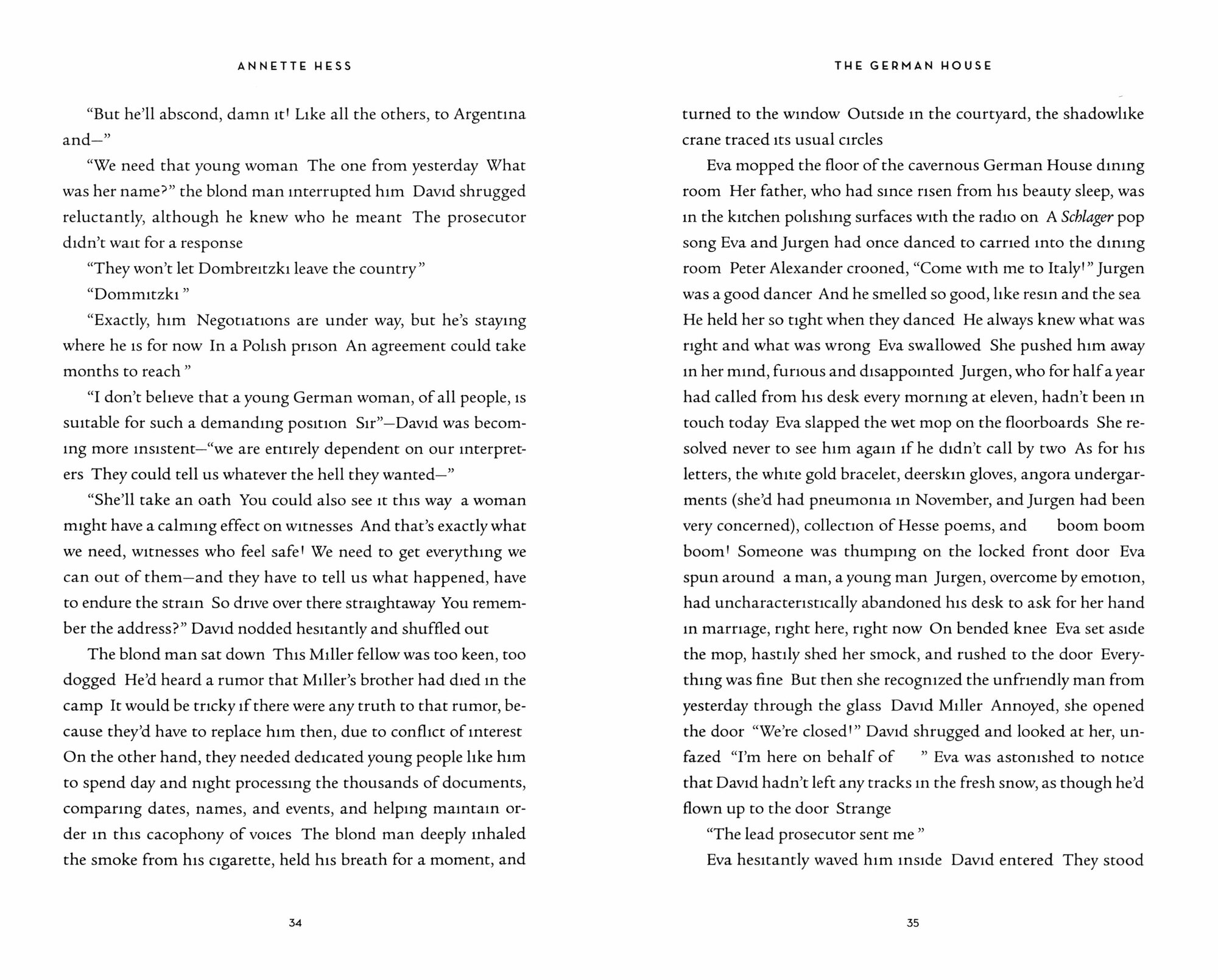 As she becomes more and more involved in the Frankfurt Trials, Eva begins to question her family’s silence on the war and her future. Why do her parents refuse to talk about what happened? What are they hiding? Does she really love Jurgen and will she be happy as a housewife? Though it means going against the wishes of her family and her lover, Eva, propelled by her own conscience, joins a team of fiery prosecutors determined to bring the Nazis to justice—a decision that will help change her country forever.