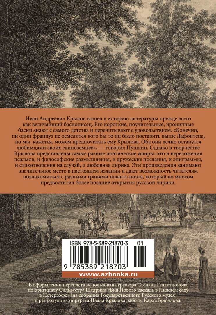 Представленное качественно выполненное издание от \"Азбуки\" дает возможность всестороннего знакомства с широтой таланта великого русского литератора XVIII столетия. Классицизм И.А. Крылова - как в сатирическом, так и в лирическом воплощениях - достигает здесь уровня звучания самых высоких европейских образцов, позволяя читателю по достоинству оценить не столь хорошо известное сейчас наследие отечественной литературы той эпохи.