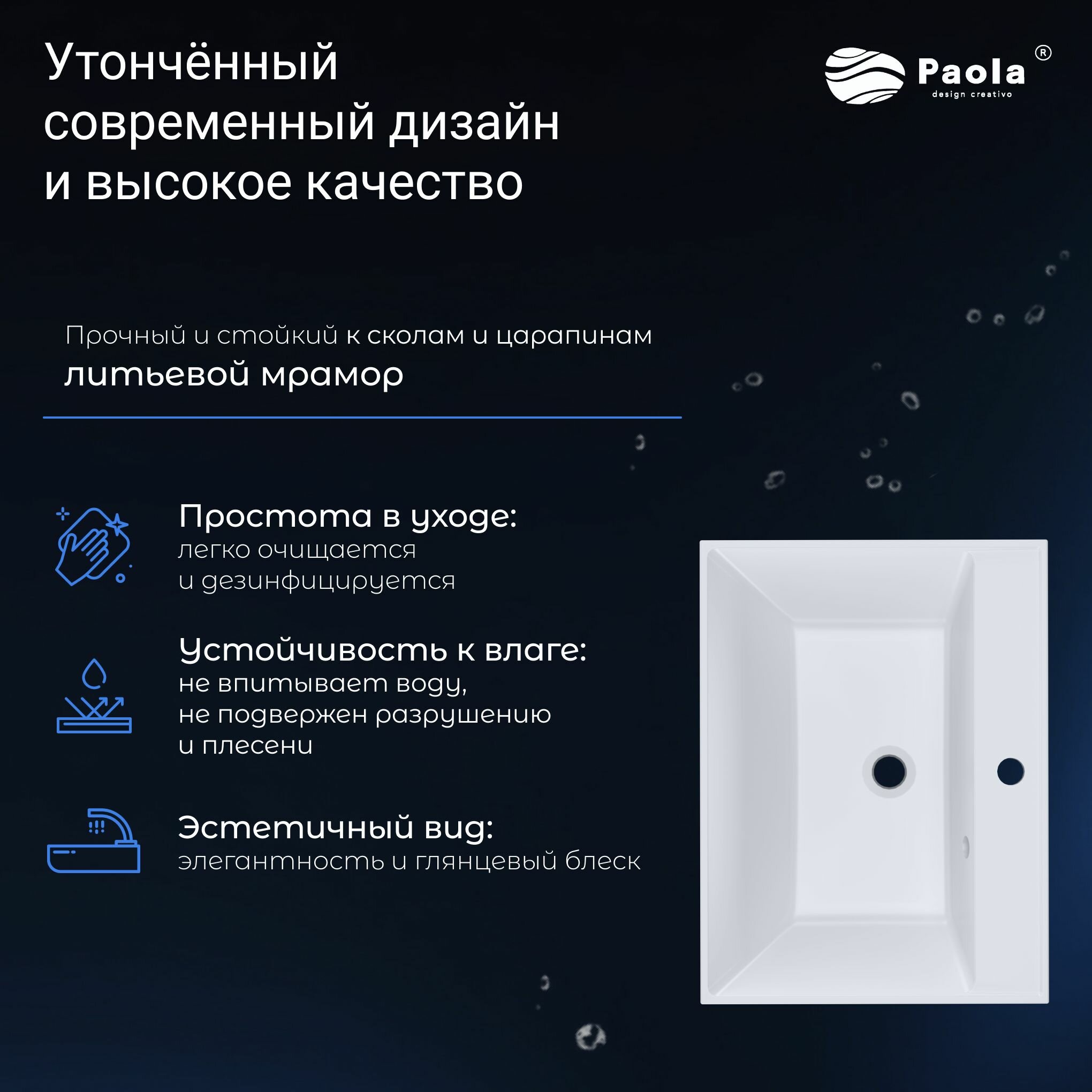 Раковина Paola Alba 600 из литьевого мрамора с отверстием под смеситель. Материал состоит из натуральной мраморной крошки и полимерных связующих смол, готовое изделие дополнительно защищается специальным покрытием - гелькоутом, препятствующим размножению вредоносных бактерий и не впитывающим обычные бытовые загрязнения. Раковина с таким покрытием не требует особого ухода, для очистки поверхности достаточно использовать жидкие неабразивные моющие средства. Сочетание мраморной крошки и акриловых смол, а также используемое защитное покрытие, позволяет сделать материал в 8 раз прочнее натурального мрамора.