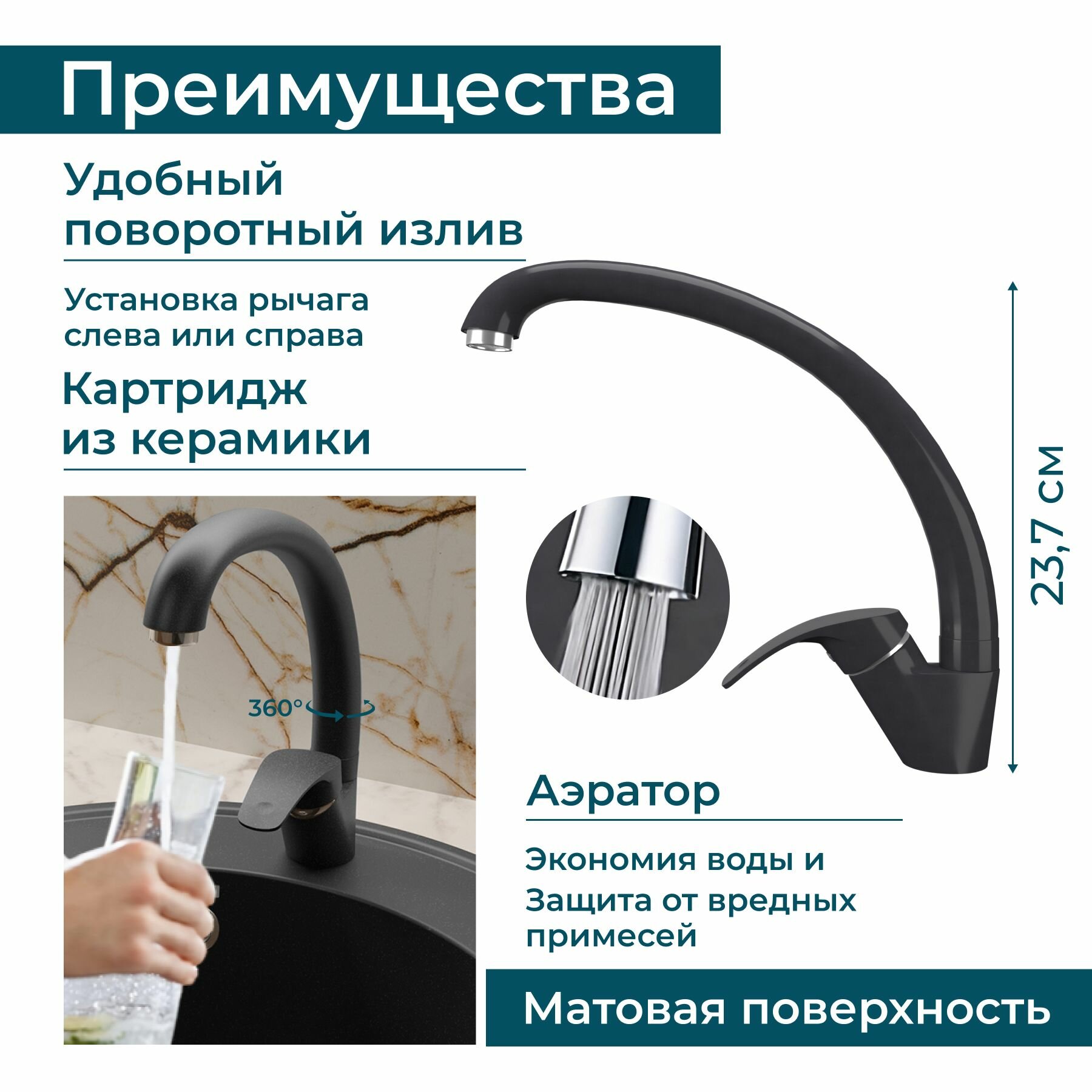 Смеситель оборудован съемным пластиковым аэратором для экономии воды и поворотным изливом на 360 градусов. В комплектацию входят: керамический картридж Wanhai, гибкая подводка 450 мм, комплект крепежных элементов, технический паспорт и гарантийный талон.