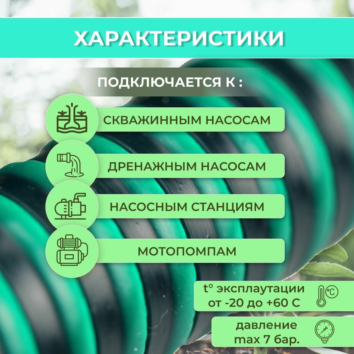 **Шланг гофрированный напорно-всасывающий** применяется для перекачки жидкостей и сыпучих материалов. Подключается к скважинным насосам, мотопомпам, насосным станциям. Изготовлен из пищевого ПВХ и армирован спиралью. Морозостойкий, устойчив к образованию водорослей, перекручиваниям, изломам. Безопасный состав с пищевым покрытием.