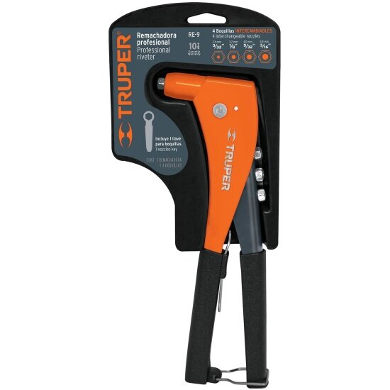 Заклёпочник профессиональный Truper RE-9 подходит для всех типов вытяжных заклёпок, диаметром 2.4; 3.2; 4.0; 4.8 мм. Устройство заклёпочника с увеличенным ресурсом использования. В комплекте прецизионные сменные насадки.