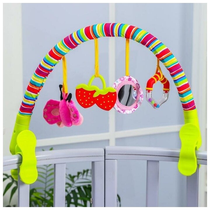 Эту дугу можно закрепить на детской кроватке, коляске или автокресле с помощью удобных прищепок. Угол наклона дуги регулируется. Дугу можно использовать с 1 месяца жизни малыша. Сначала малыш будет просто рассматривать яркие игрушки, лежа на спинке, но со временем он обязательно начнет тянуться к ним ручками и ножками, совершенствуя свои двигательные навыки. Игрушки на дуге сделаны из разных материалов - специально для развития тактильных ощущений малышей. В набор входят: мягкая игрушка бабочка, безопасное зеркальце, погремушка-колечко с прорезывателем, прорезыватель клубничка.