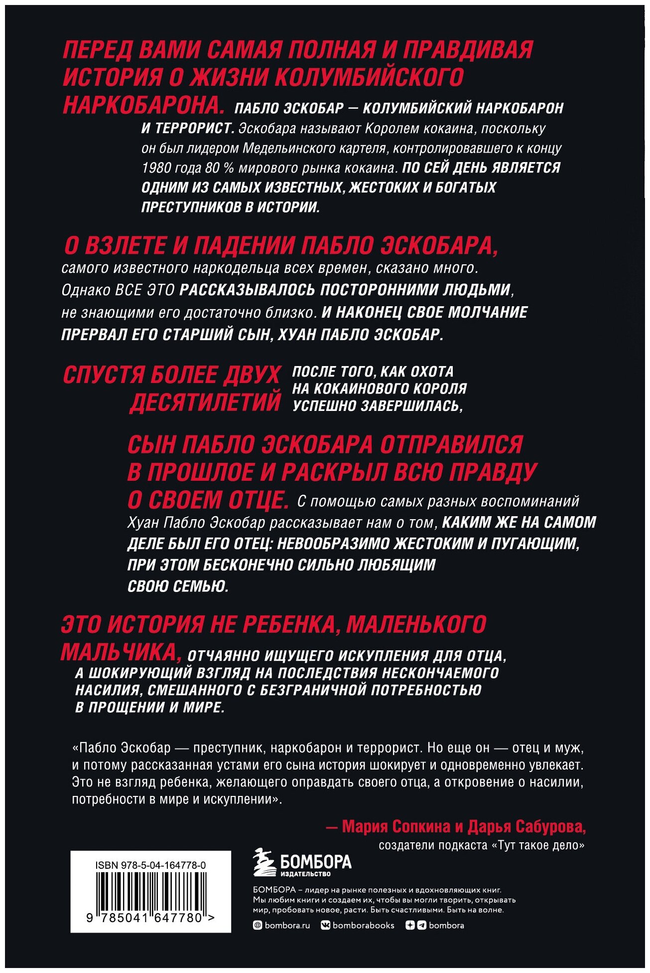 "Пабло Эскобар - преступник, наркобарон и террорист. Но еще он - отец и муж, и потому рассказанная устами его сына история шокирует и одновременно увлекает. Это не взгляд ребенка, желающего оправдать своего отца, а откровение о насилии, потребности в мире и искуплении". - Мария Сопкина и Дарья Сабурова, создатели подкаста "Тут такое дело"