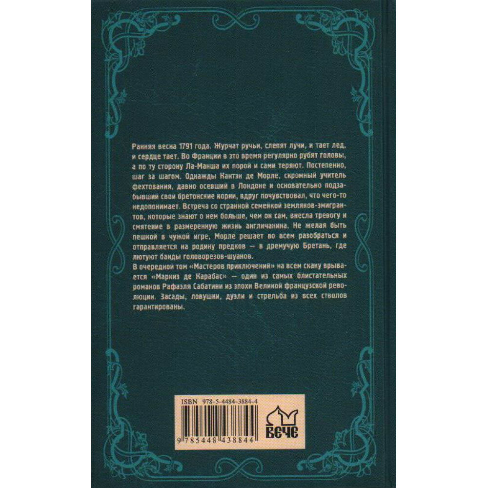 В очередной том "Мастеров приключений" на всем скаку врывается "Маркиз де Карабас" - один из самых блистательных романов Рафаэля Сабатини из эпохи Великой французской революции. Засады, ловушки, дуэли и стрельба из всех стволов гарантированы.