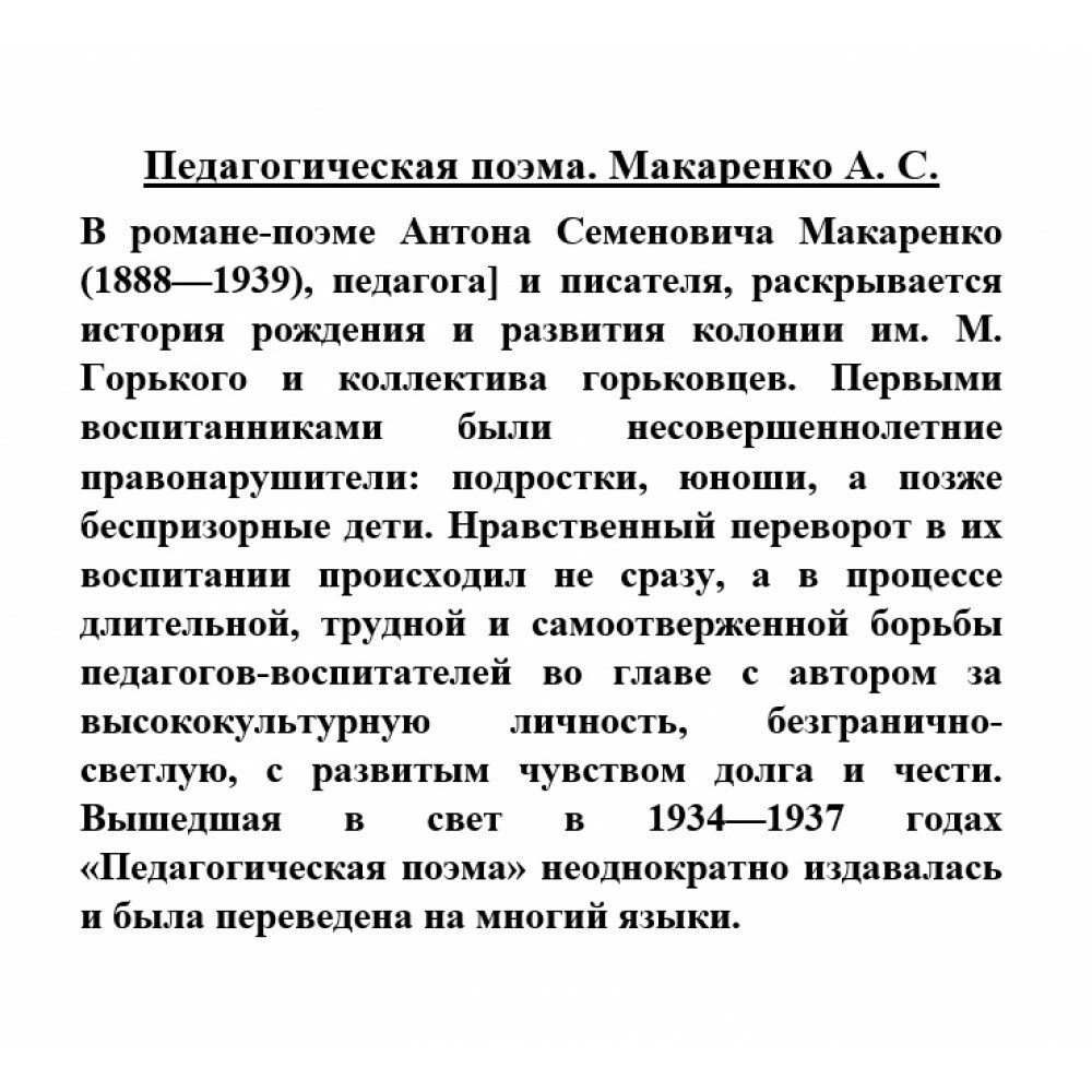 В романе-поэме Антона Семеновича Макаренко (1888—1939), педагога и писателя, раскрывается история рождения и развития колонии им. М. Горького и коллектива горьковцев. Первыми воспитанниками были несовершеннолетние правонарушители: подростки, юноши, а позже беспризорные дети. Нравственный переворот в их воспитании происходил не сразу, а в процессе длительной, трудной и самоотверженной борьбы педагогов-воспитателей во главе с автором за высококультурную личность, безгранично-светлую, с развитым чувством долга и чести. Вышедшая в свет в 1934—1937 годах «Педагогическая поэма» неоднократно издавалась и была переведена на многие языки.