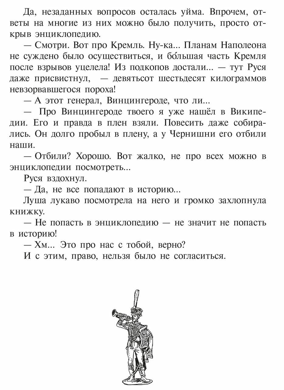 Повесть действительно интересная. Кроме того, главные герои - наши современники. А это всегда интересно - читать о таких же ребята, как и ты сам. Написана книга захватывающее и увлекательно, в ней как живые проходят перед читателем Кутузов и Наполеон, Фигнер и Коленкур, лица реальные и вымышленные. Это гораздо интереснее любого учебника истории.