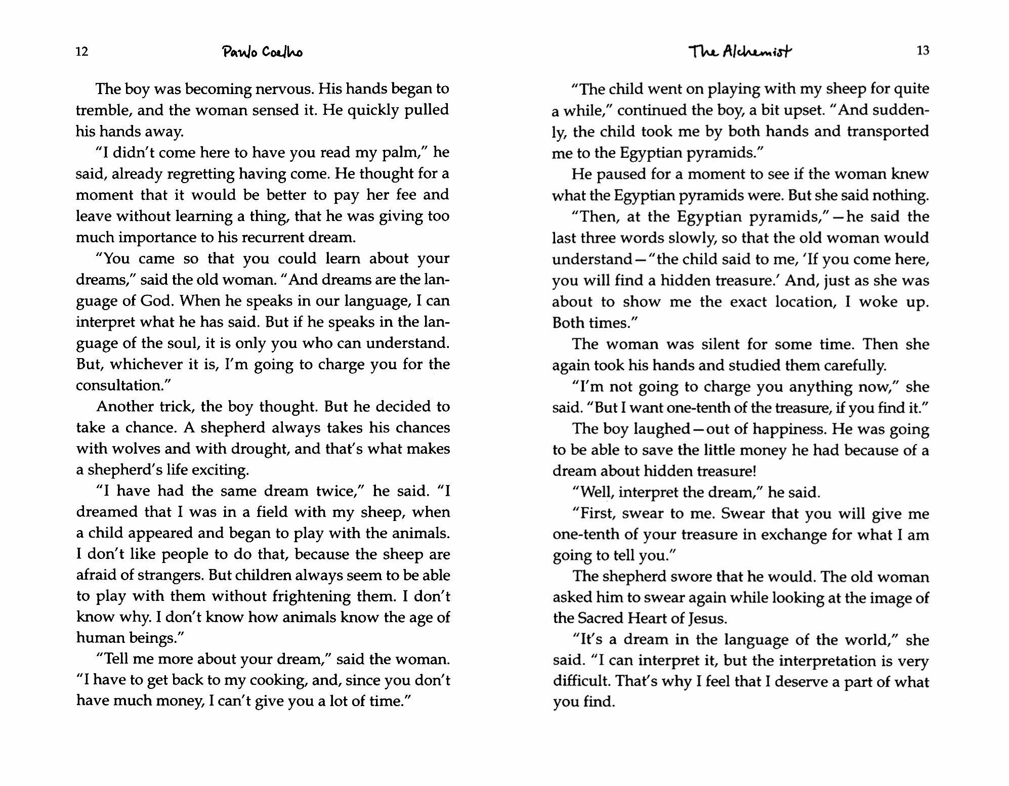 Когда я чувствую себя потерянной, подавленной, грустной, конфликтной, разочарованной, измученной, я беру в руки эту книгу и слежу за путешествием молодого пастуха Сантьяго, который ищет мирские сокровища. Как сказал Т.С. Элиот, the journey not the arrival matters (важно не прибытие, а путешествие). Это путешествие посвящено самопознанию, борьбе с собственными демонами, сердцу, которое должно стать твоими глазами и вести тебя по темным и опасным дорогам жизни. Это эпическая, возвышающая, мотивирующая, вдохновляющая, проникновенная, пронзительная книга! Мои любимые цитаты (вольный перевод):