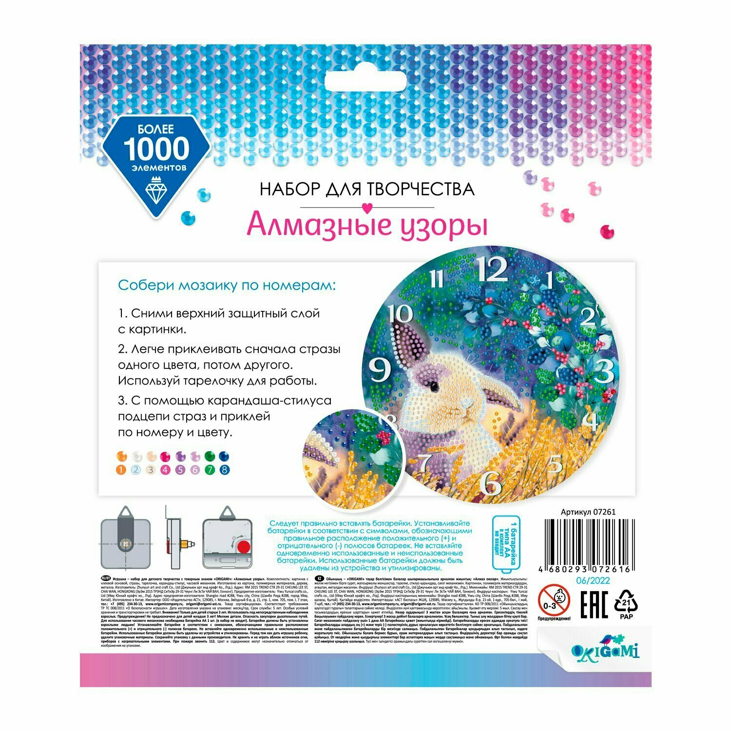 В наборе: картинка с клейкой основой диаметром 20 см, стразы (1000+), карандаш-стилус, тарелочка, часовой механизм.