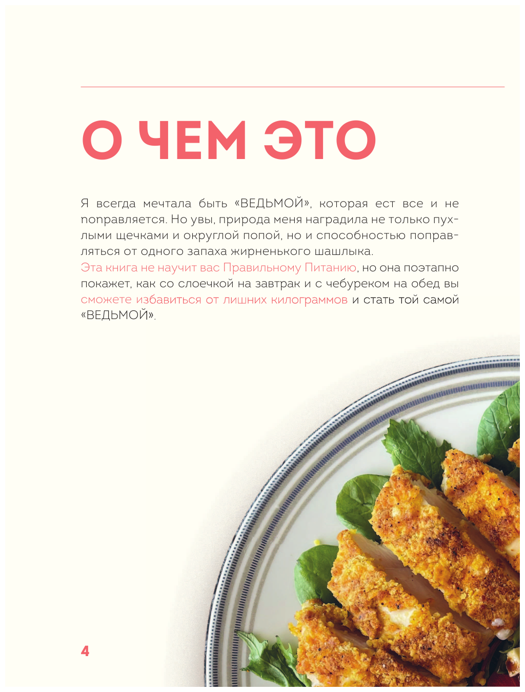 Все ведьминские секреты этой книги основаны на правильности приготовления пищи и режиме питания, который должен быть. Ведь основная проблема лишнего веса это как раз таки в отсутствии определенного режима приёма пищи. К моему счастью, книга не навязывает \"правильное питание\" (оно же ПП). Ведь, чтобы сидеть на подобном питании скорее нужно быть не ведьмой, а просто хорошо зарабатывать. Напротив, здесь собраны вполне адекватные рецепты и рекомендации. Много полезных советов. Для меня открылись тайны совместимости еды между собой.