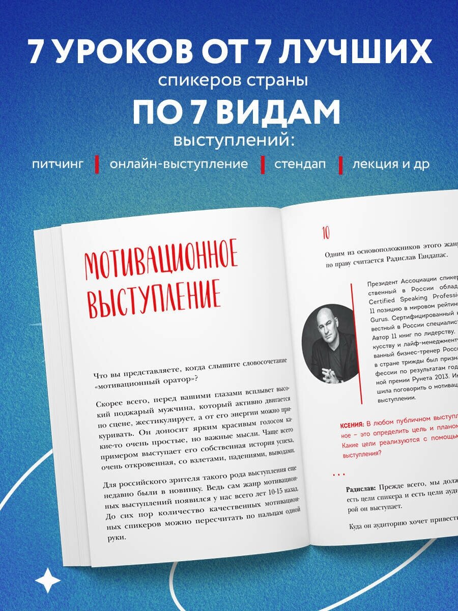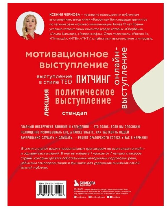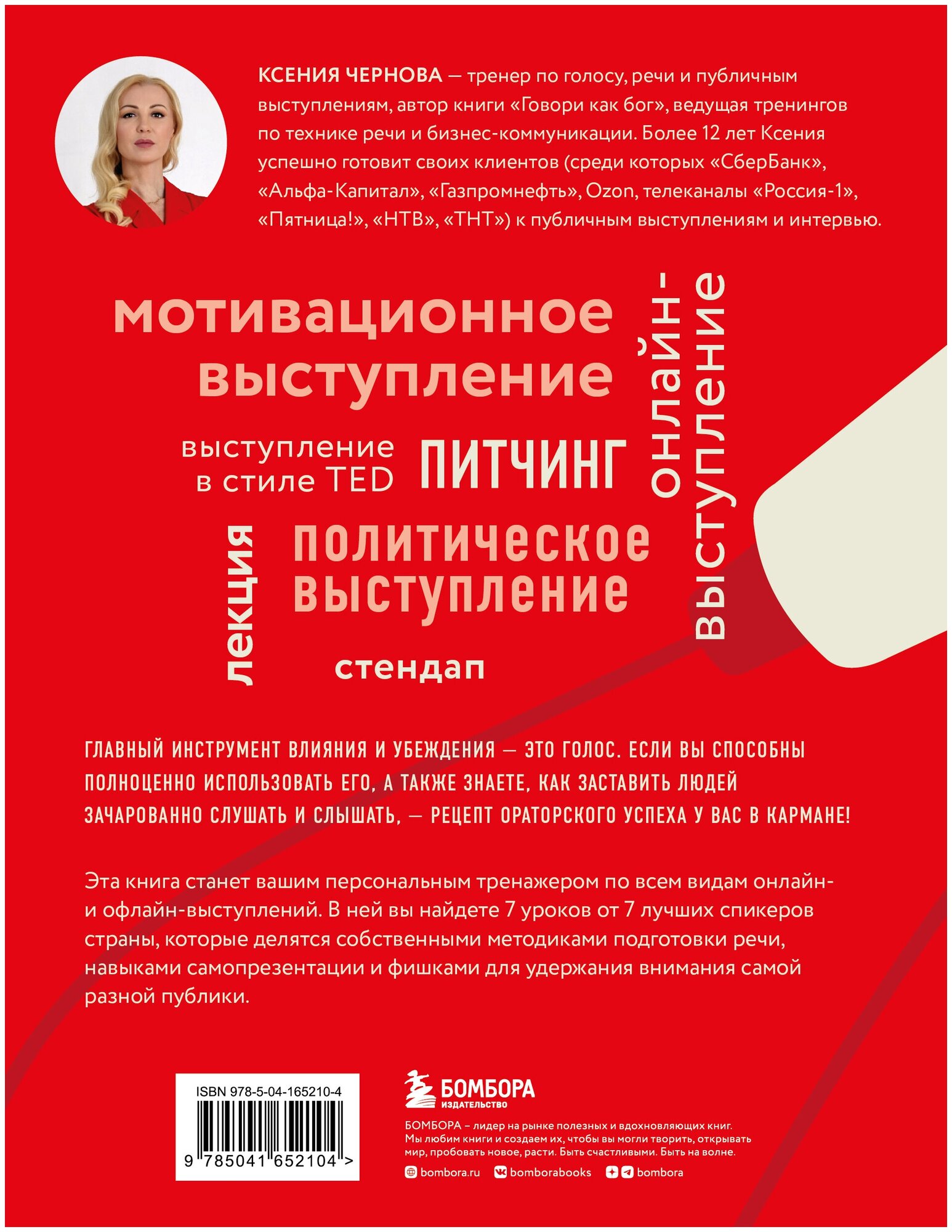 Ксения Чернова - тренер по технике речи и курсов по постановке голоса, более 10 лет успешно готовит к публичным выступлениям и интервью представителей таких компаний, как Rambler&Co, "Газпром нефть", телеканал "Россия 1" и многих других. Ее книга станет вашим персональным тренажером по всем видам онлайн- и оффлайн-выступлений. В ней вы найдете 7 уроков от 7 лучших спикеров страны, которые делятся собственными методиками подготовки речи, навыками самопрезентации и фишками для удержания внимания самой разной публики.