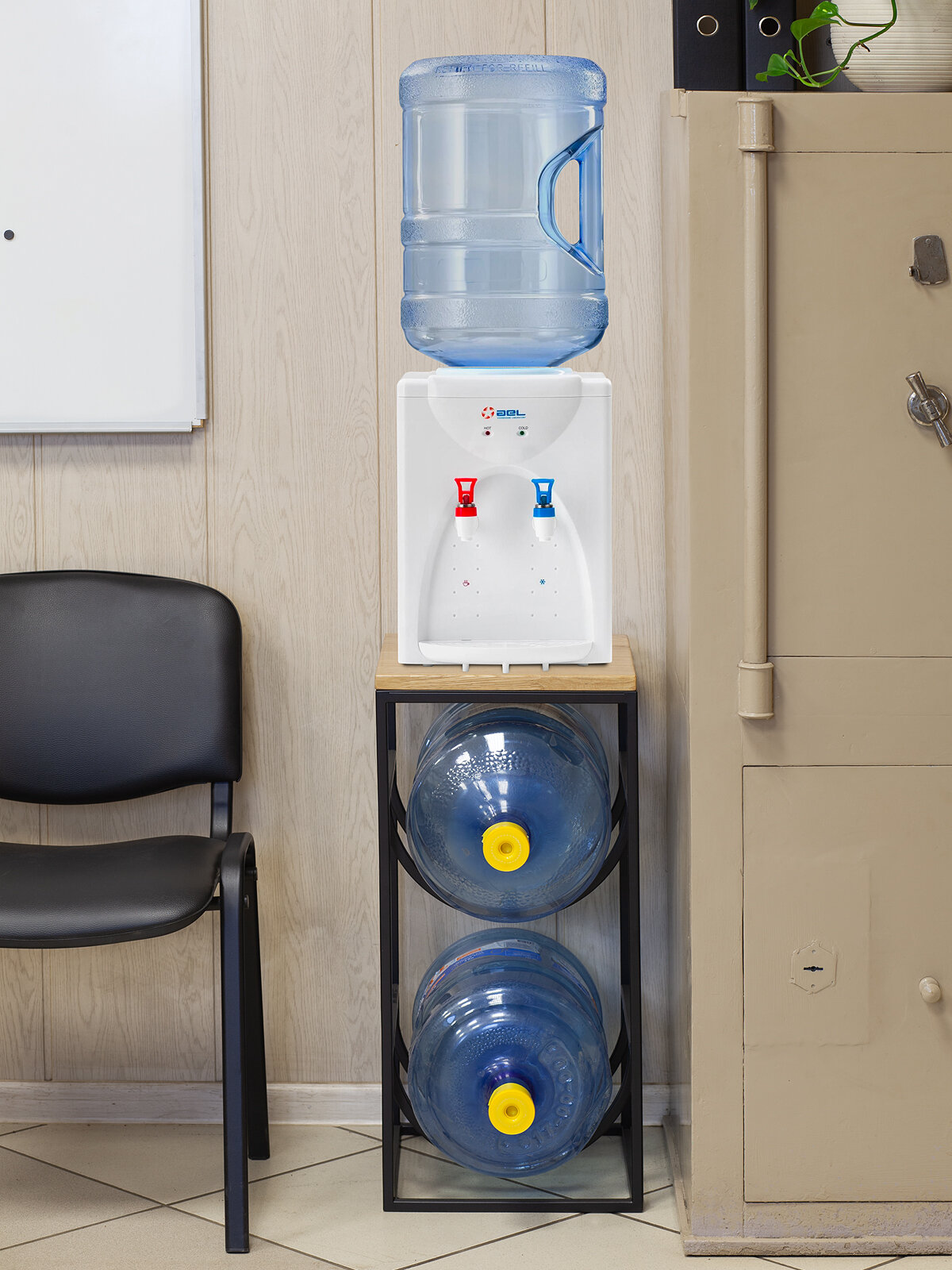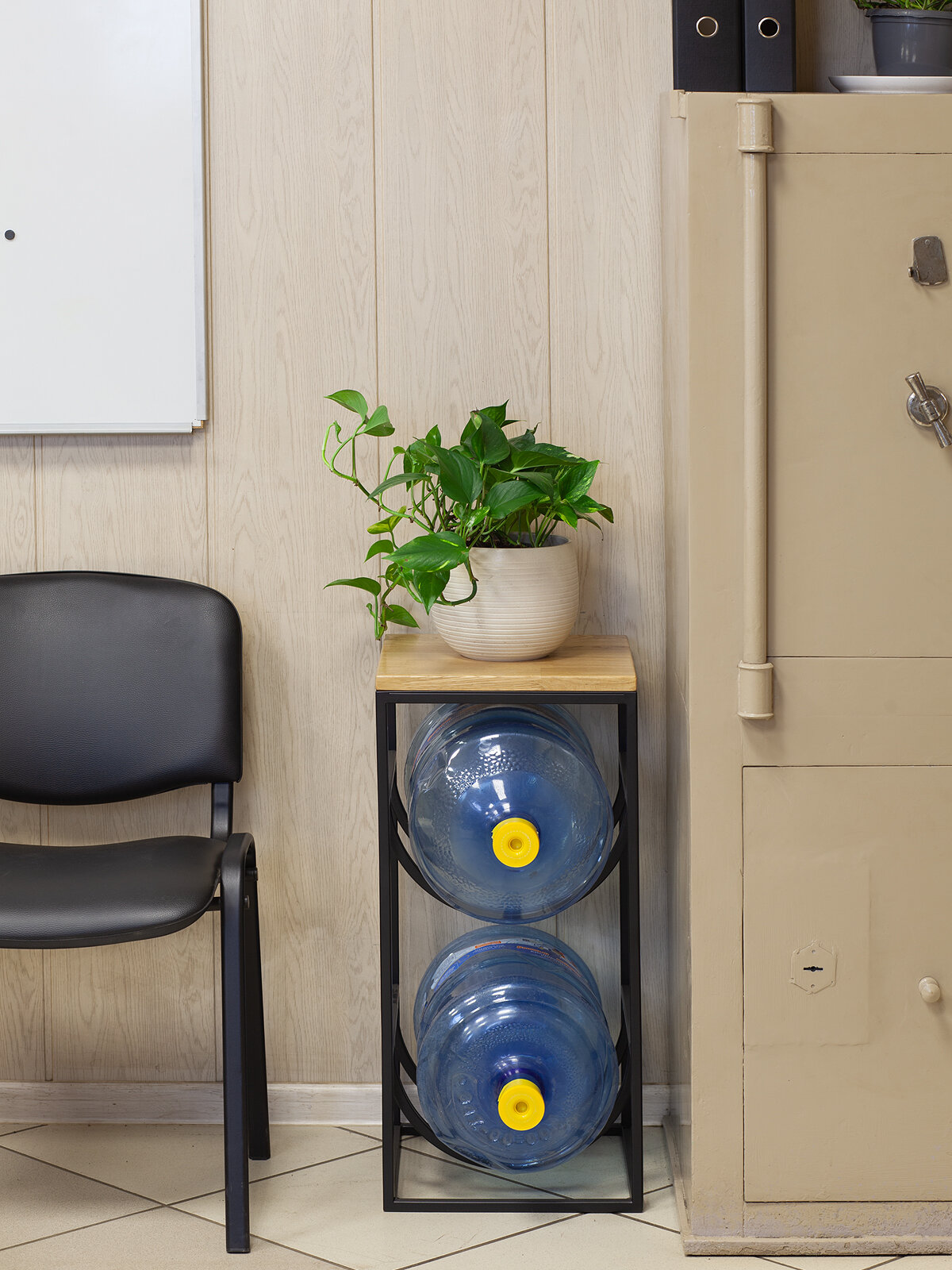 Регулярно заказываете воду, но бутылки стоят то на полу, то под столом, то на подоконнике? Мы полностью пересмотрели хранение даже таких неожиданных вещей, как бутыли для воды. Ведь хранение и вещи, с которыми мы соприкасаемся в бытовой жизни тоже должны быть красивы и функциональны. В подставке для бутылок горизонтально размещаются две стандартные бутыли по 19л. Верхнюю часть подставки можно использовать как столик для установки кулера, тем самым используя пространство максимально функционально и удобно! Подставка и столик изготовлены из стали, что делает подставку надёжной и способной выдержать большой вес без деформации (до 30 кг на столик плюс 2 полные бутылки в полках). В качестве столешницы использовано дерево толщиной 20 мм. Использование подставки позволяет более компактно разместить бутилированную воду, иметь к ней удобный доступ. Кроме того, подставка позволяет хранить воду в бутылках при включённом теплом поле и вода при этом не зацветает, как случается при непосредственном размещении бутылки на тёплом полу. Окраска выполнена высококачественной порошковой краской с матовым эффектом. Высота столика, на котором может стоять кулер 118 см.