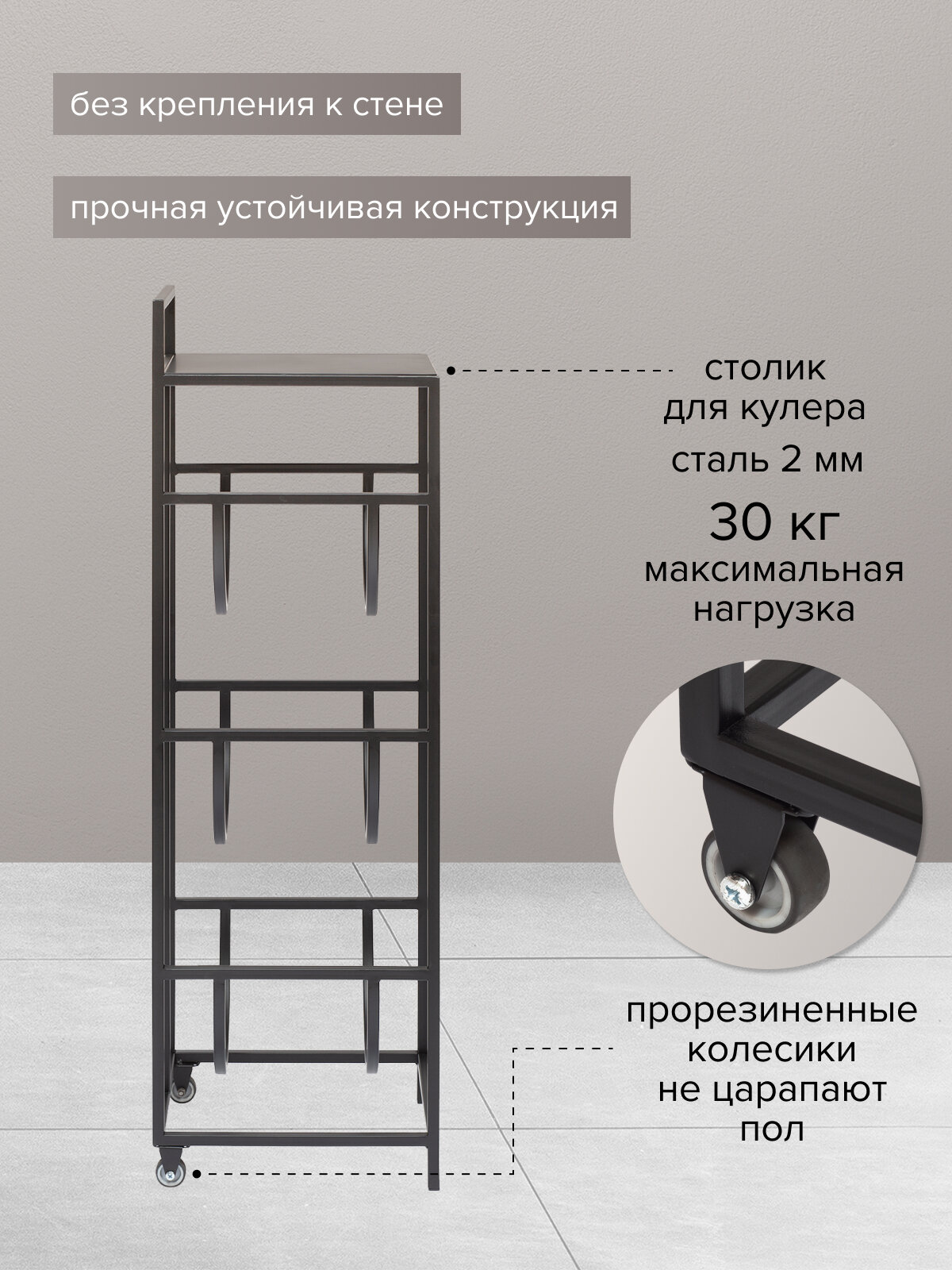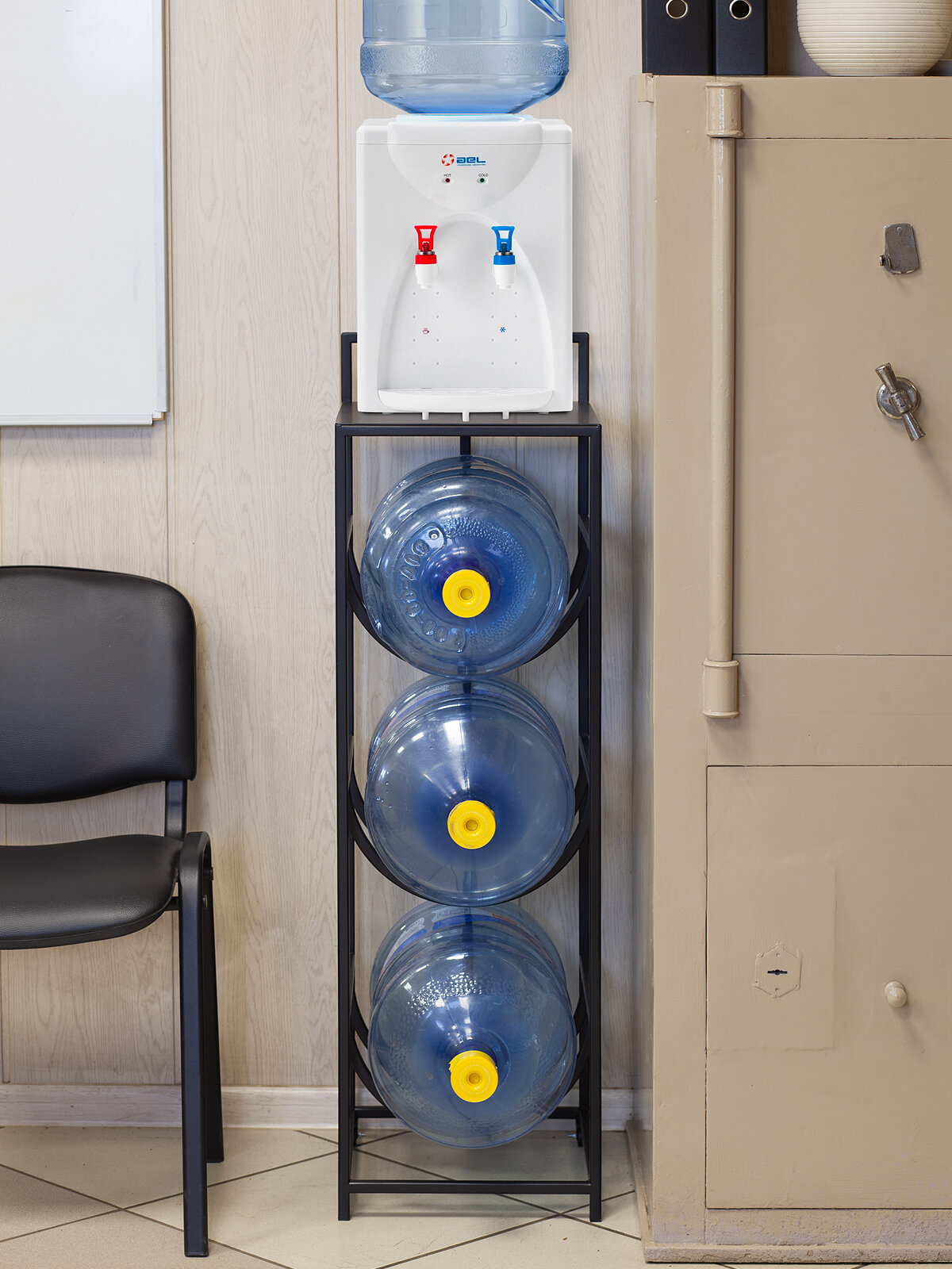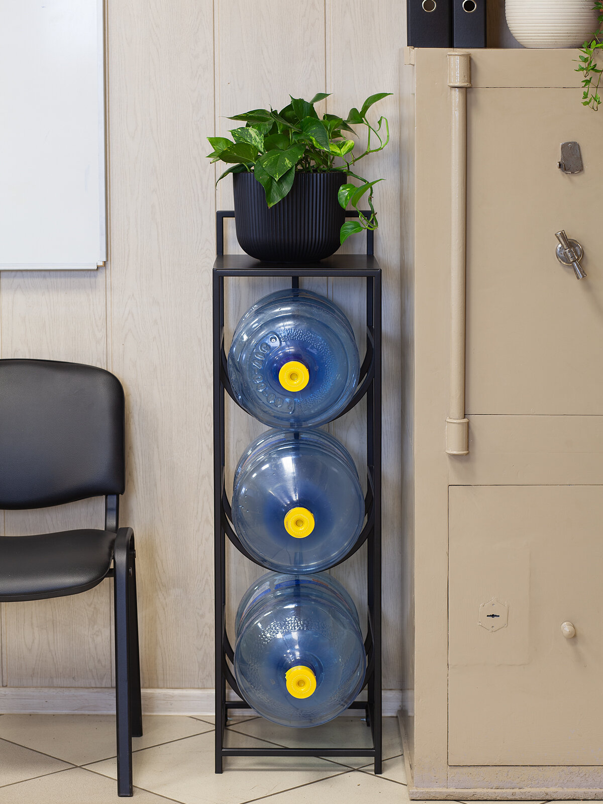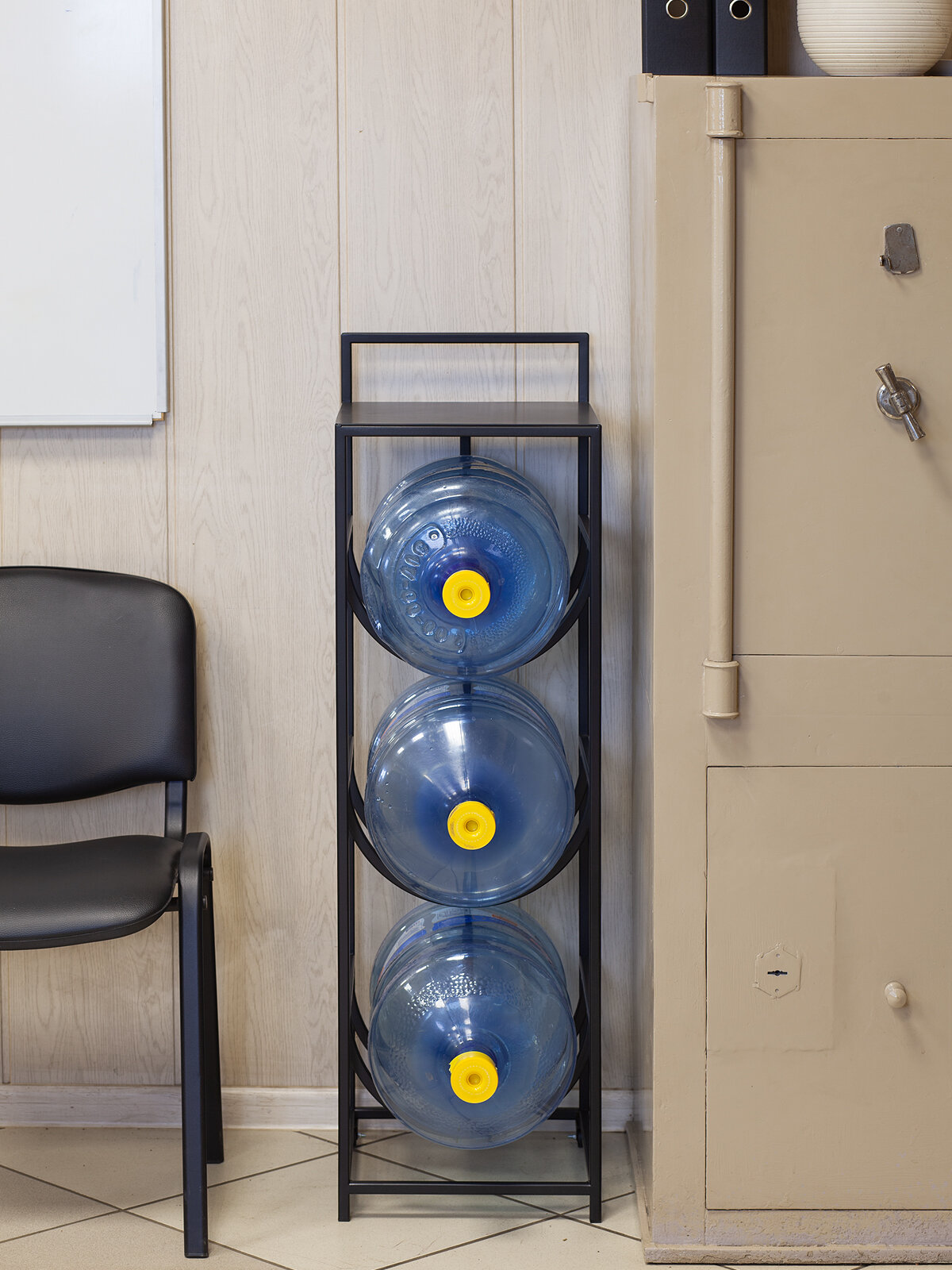 Регулярно заказываете воду, но бутылки стоят то на полу, то под столом, то на подоконнике? Мы полностью пересмотрели хранение даже таких неожиданных вещей, как бутыли для воды. Ведь хранение и вещи, с которыми мы соприкасаемся в бытовой жизни тоже должны быть красивы и функциональны. В подставке для бутылок горизонтально размещаются три стандартные бутыли по 19л. Верхнюю часть подставки можно использовать как столик для установки кулера, тем самым используя пространство максимально функционально и удобно! Подставка и столик изготовлены из стали, что делает подставку надёжной и способной выдержать большой вес без деформации (до 30 кг на столик плюс 3 полные бутылки в полках). В качестве столешницы использовано дерево толщиной 20 мм. Использование подставки позволяет более компактно разместить бутилированную воду, иметь к ней удобный доступ. Кроме того, подставка позволяет хранить воду в бутылках при включённом теплом поле и вода при этом не зацветает, как случается при непосредственном размещении бутылки на тёплом полу. Окраска выполнена высококачественной порошковой краской с матовым эффектом. Высота столика, на котором может стоять кулер 117 см.
