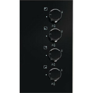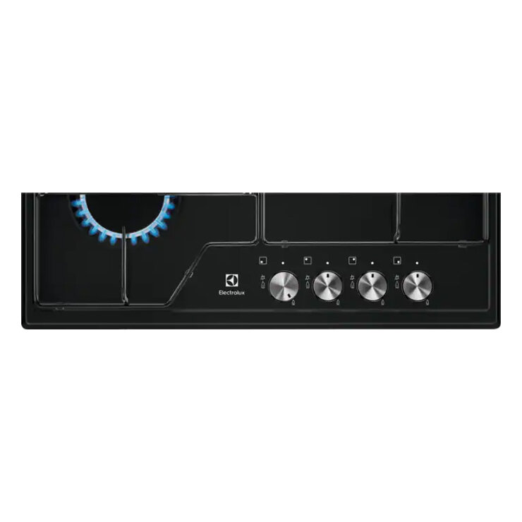 Варочная панель Electrolux имеет четыре конфорки мощностью 1 кВт, 1,9 кВт, 1,9 кВт и 3 кВт. Четыре чугунные решетки устойчивы и на них можно расположить различную посуду. Управление находится сбоку, с правой стороны. Поворотные переключатели позволяют вкупе с электроподжигом в одно движение начать работу. Газ-контроль блокирует подачу газа в случаях, когда пламя было затушено.