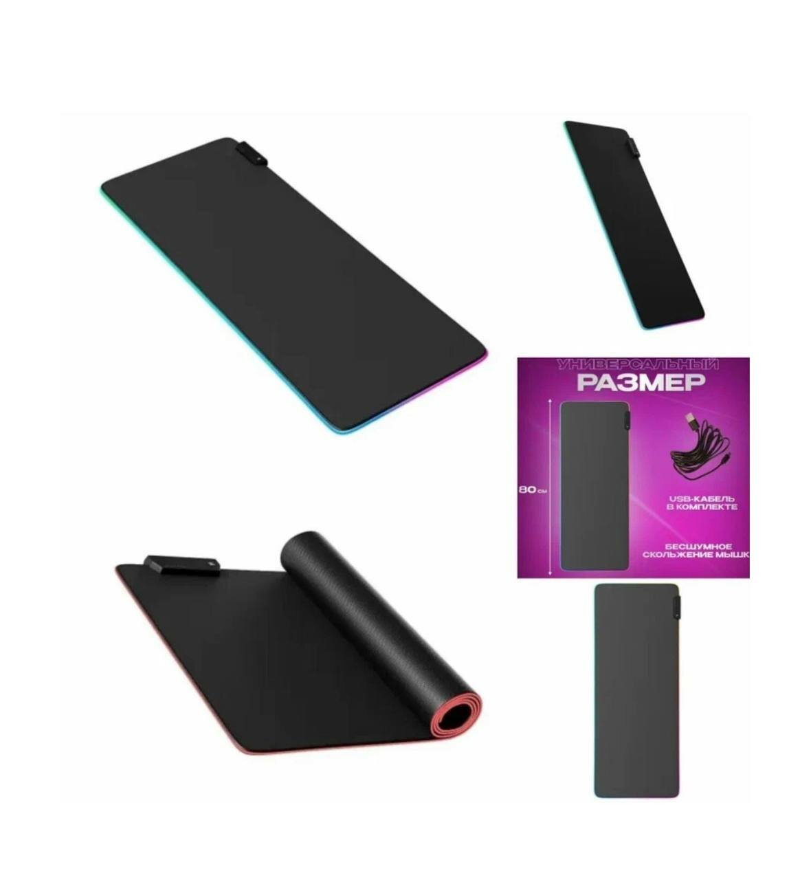 Широкий коврик 850*350*3мм с прорезиненным основанием с RGB подсветкой. На коврике можно разместить клавиатуру и мышку и забыть про границы у коврика. Материал верха сделан из специальной ткани, повышающей контроль над каждый движением мышки. Одним нажатием можно переключаться между 14 режимами подсветки