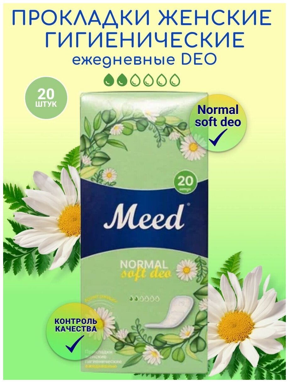 Прокладки женские гигиенические «Meed» ежедневные целлюлозные софт ДЕО (Normal Soft Deo), 20 шт. Обеспечивают сухость в интимной зоне. Защита No1 - лучшее соотношение надежности и комфорта среди прокладок. Дарят ощущение чистоты длительное время, и помогают всем девушкам чувствовать себя красивыми и женственными. Они настолько тонкие и гибкие, что вы их даже не почувствуете. Их особая форма повторяет каждое ваше движение и подойдет для любого типа нижнего белья. Клейкая прослойка от края до края надежно фиксирует прокладку, предотвращая ее смещение. Специальное тиснение ежедневок обеспечивает равномерное распределение жидкости и удержание ее внутри. Предназначены для впитывания выделений, их можно использовать как ночные и дневные средства гигиены для ежедневного использования. Применимы для взрослых женщин, беременных и будущих мам, для девушек и девочек подростков для каждодневного ношения, при начинающихся месячных или скудных выделений в критические менструальные дни. Изготовлены из целлюлозы с повышенной впитывающей способностью. Гладкая мягкая и нежная поверхность способствует удобному пользованию Супертонкие одноразовые гипоаллергенные дышащие ежедневки исключают возможность возникновения раздражений и опрелостей. Компактный размер обеспечит удобство в повседневном применении, можно положить в сумку или маленькую косметичку. Гигиениические разовые прокладки бренда "Meed", сочетающие важные для большинства женщин свойства - надежность, нежность и ощущение естественного ухода и здоровья. Незаменимые защитные предметы личной гигиены для каждой представительницы прекрасного пола. При изготовлении применены новейшие технологии, что позволило сделать их максимально тонкими при том же уровне впитываемости. Прокладки дерматологически протестированы, не содержат в своем составе красителей и прочих вредных веществ. Все изделия изготовлены на современном оборудовании, содержат многослойную структуру - покровный, абсорбирующий, защитный слои. Продукция произведена по госту, свидетельство о государственной регистрации удостоверяет полное соответствие товара гос. стандартам качества. Постоянный контроль и независимые испытания подтвердили более высокую скорость влагопоглощения и впитываемый объем, чем у известных брендовых аналогов. Способ применения: каждодневные, рекомендуется менять один раз в 4 часа. Меры предосторожности: беречь от влажности и высоких температур, не смывать в унитаз. Убедитесь, что изделие не просрочено, а упаковка не повреждена. Удалив защитную бумагу с клеевой полосы, закрепите прокладку на внутренней поверхности белья.