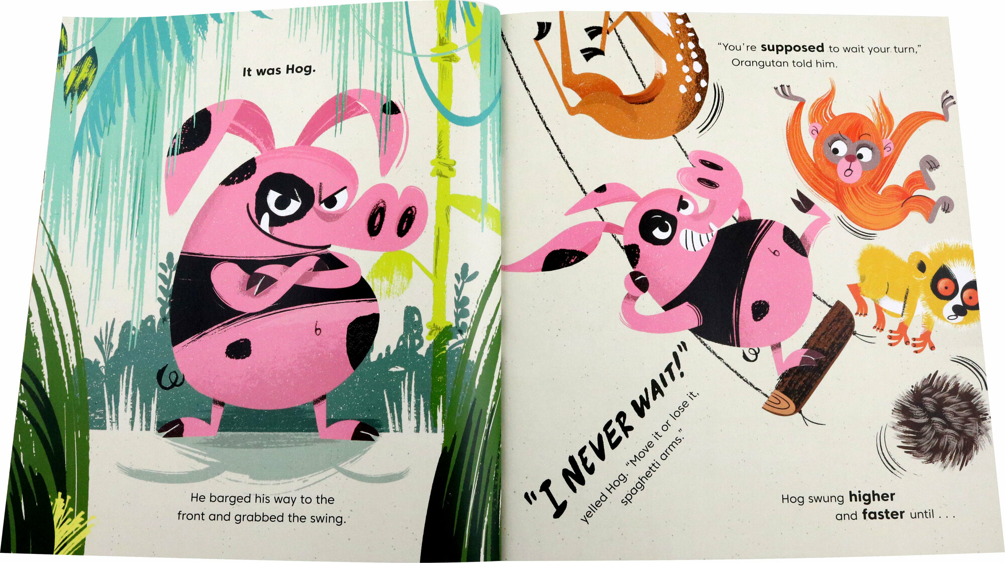 The animals of the jungle are all very good at sharing and taking turns… All except Hog. Hog barges and grabs, yells and stomps. He's greedy and bad-tempered and terribly, terribly rude.