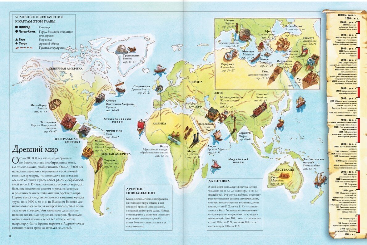 Этот атлас - настоящий гид по всемирной истории. Благодаря прекрасно иллюстрированным, подробным картам, лентам времени по каждому периоду, тематическим блокам, фотографиям и рисункам вы будете перемещаться во времени и пространстве: от древнейших цивилизаций до современных государств, из Новой Зеландии в Африку и на Аляску.