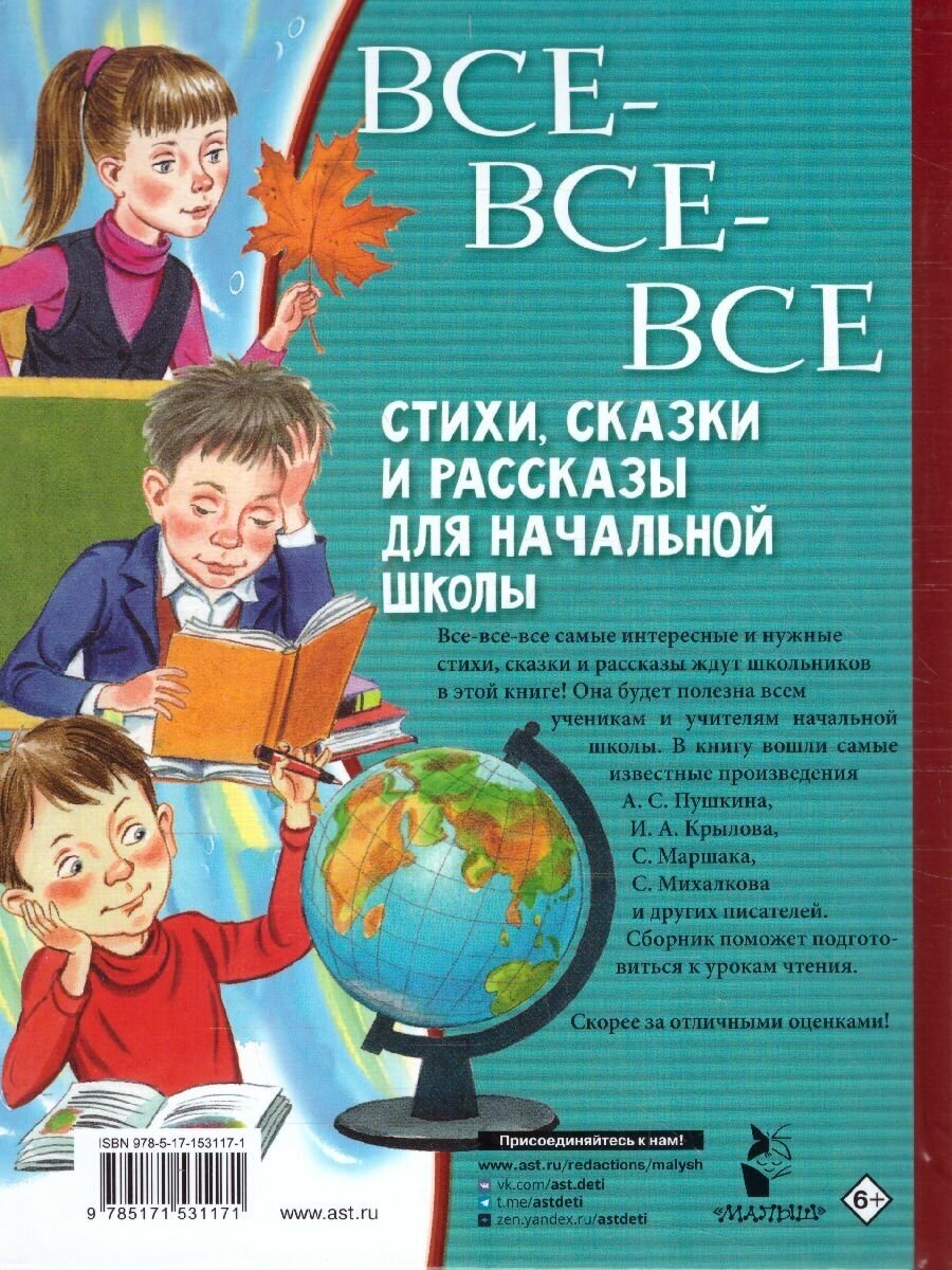 На сегодняшний день товар «Книга: Все-все-все стихи сказки и рассказы для начальной школы (Толстой Лев Николаевич, Маршак Самуил Яковлевич, Чуковский Корней Иванович, Михалков Сергей Владимирович, Пушкин Александр Сергеевич, Зощенко Михаил Михайлович); ИЗДАТЕЛЬСТВО "АСТ", 2022» можно купить с кешбеком в 3 магазинах: Читай-город, book24, Буквоед