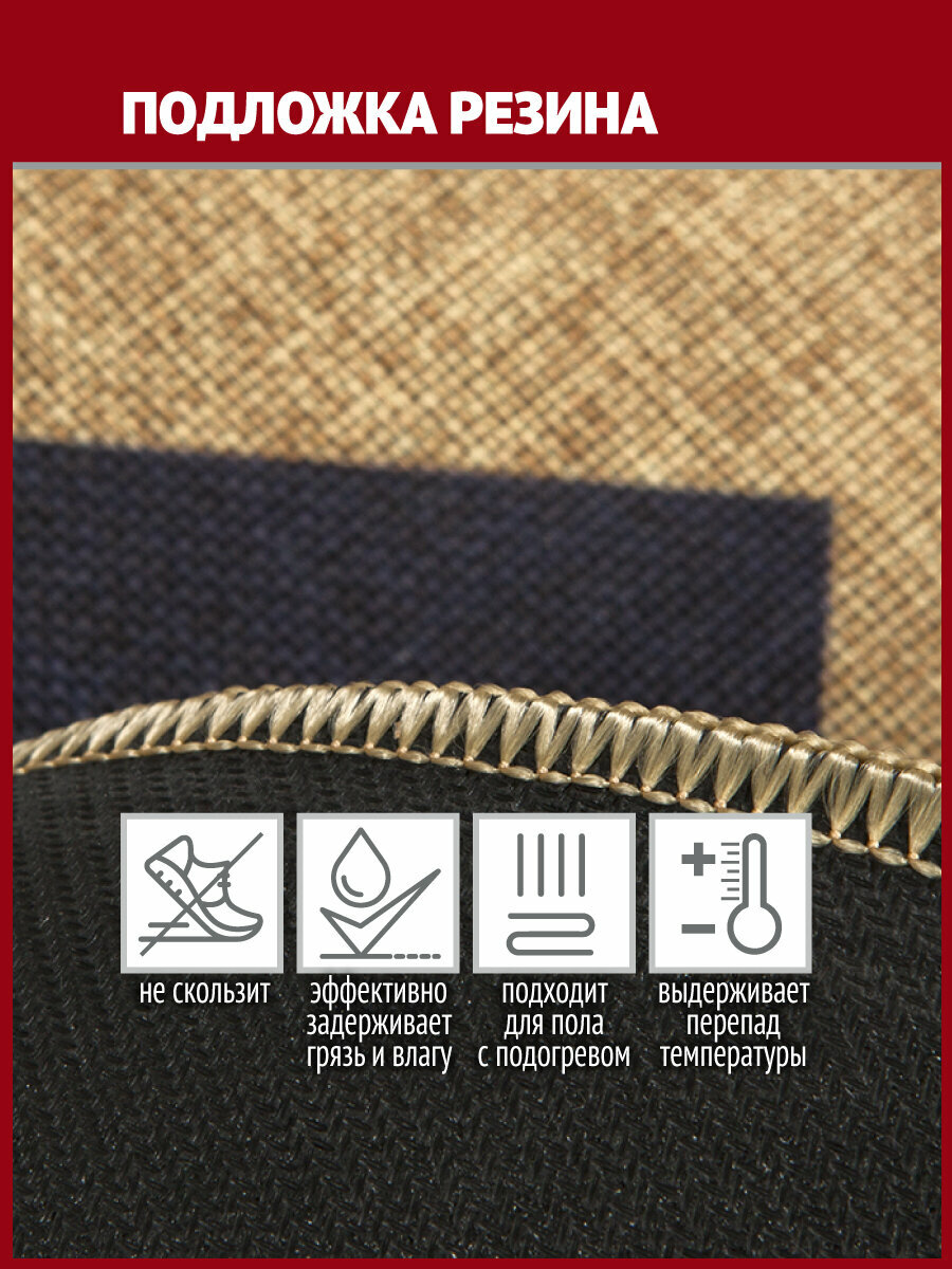 Этот элегантный придверный коврик подходит для использования внутри помещений. Его полипропиленовый тафтинговый ворс с плотной структурой моментально впитывает большое количество влаги (до 5 литров/кв.м) и эффективно очищает обувные подошвы от мелкого мусора и песка. Задерживая всю пыль и грязь, коврик сохранит чистоту напольного покрытия, поэтому уборку можно делать реже. Эластичная подложка из ПВХ с широким кантом придает изделию дополнительную прочность и препятствует протеканию жидкости на пол.