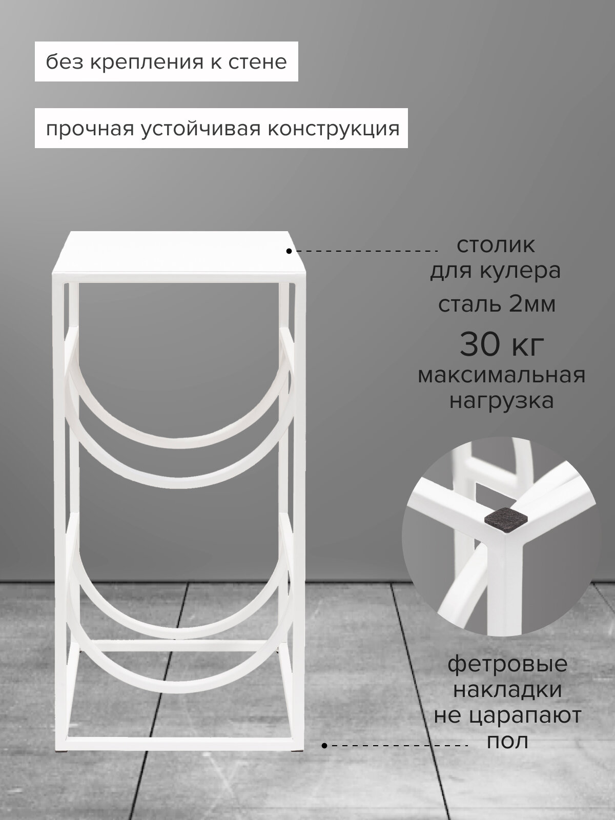 Регулярно заказываете воду, но бутылки стоят то на полу, то под столом, то на подоконнике? Мы полностью пересмотрели хранение даже таких неожиданных вещей, как бутыли для воды. Ведь хранение и вещи, с которыми мы соприкасаемся в бытовой жизни тоже должны быть красивы и функциональны. В подставке для бутылок горизонтально размещаются две стандартные бутыли по 19л. Верхнюю часть подставки можно использовать как столик для установки кулера, тем самым используя пространство максимально функционально и удобно! Подставка и столик изготовлены из стали, что делает подставку надёжной и способной выдержать большой вес без деформации (до 30 кг на столик плюс 2 полные бутылки в полках). В качестве столешницы использован лист стали 2 мм. Использование подставки позволяет более компактно разместить бутилированную воду, иметь к ней удобный доступ. Кроме того, подставка позволяет хранить воду в бутылках при включённом теплом поле и вода при этом не зацветает, как случается при непосредственном размещении бутылки на тёплом полу. Окраска выполнена высококачественной порошковой краской с матовым эффектом. Высота столика, на котором может стоять кулер 70 см.