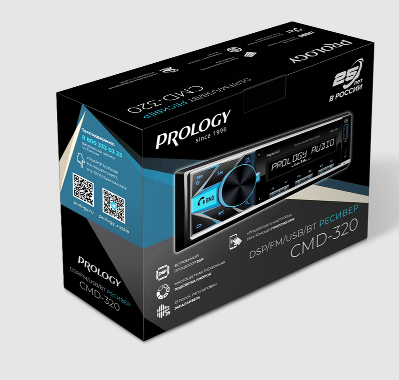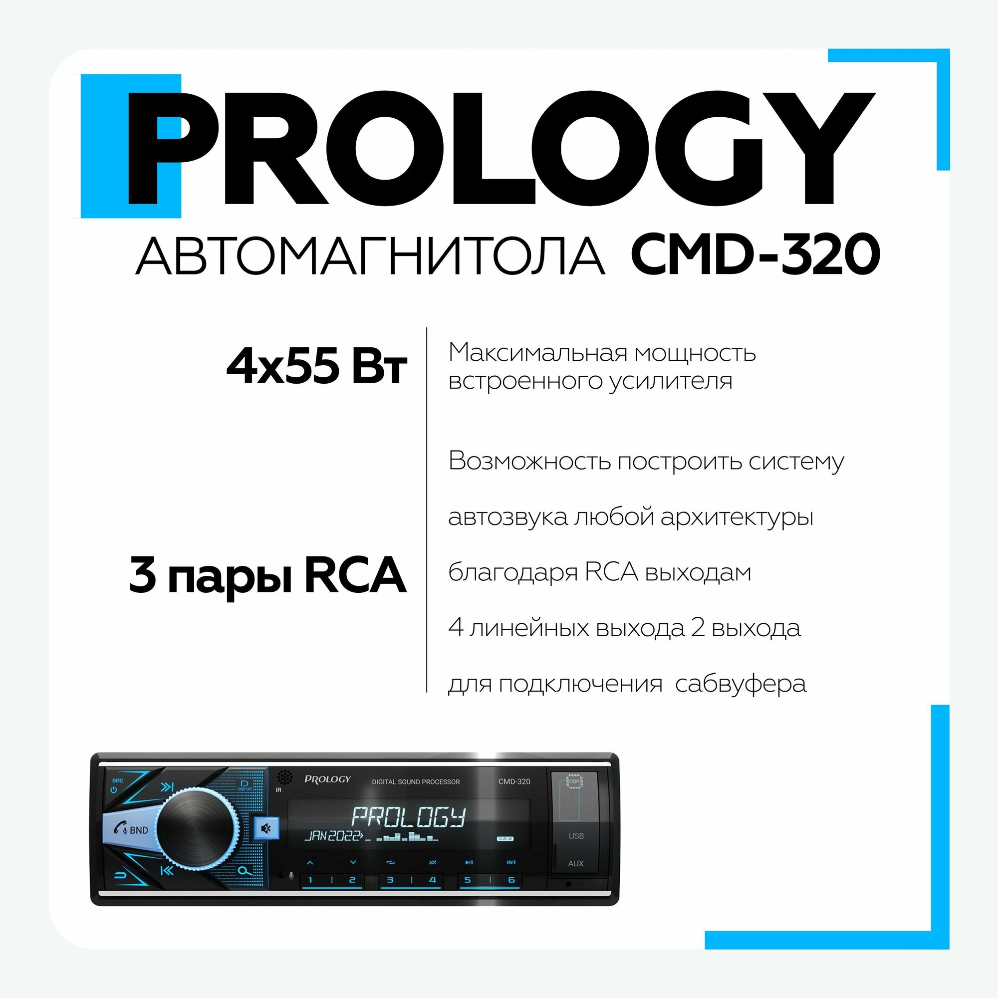 PROLOGY CMD-320 — FM / USB ресивер с Bluetooth и встроенным DSP - аудиопроцессором, стандартного размера 1DIN, который обеспечивает прием радиостанций в диапазоне FM / УКВ / AM и воспроизведение аудиофайлов MP3, WAV, и FLAC форматов, записанных на USB накопители, передачу звука с внешних источников через линейный аудиовход и беспроводной интерфейс Bluetooth. Поддерживается управление мобильным телефоном через интерфейс Bluetooth (ver. 4, 2). Устройством можно управлять при помощи мобильного приложения Prology Audio, установленного на Ваш смартфон с операционной системой Android или iOS.