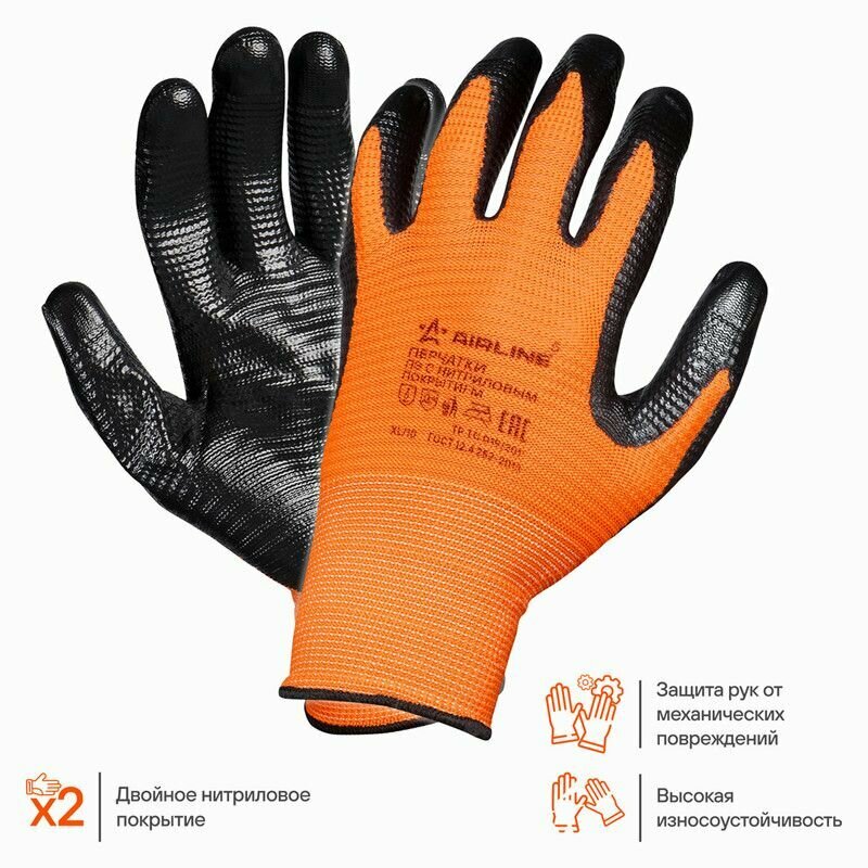 Перчатки полиэфирные с двухслойным нитрил.покрытием ладони (XL) оранж./черн. AIRLINE (ADWG004)