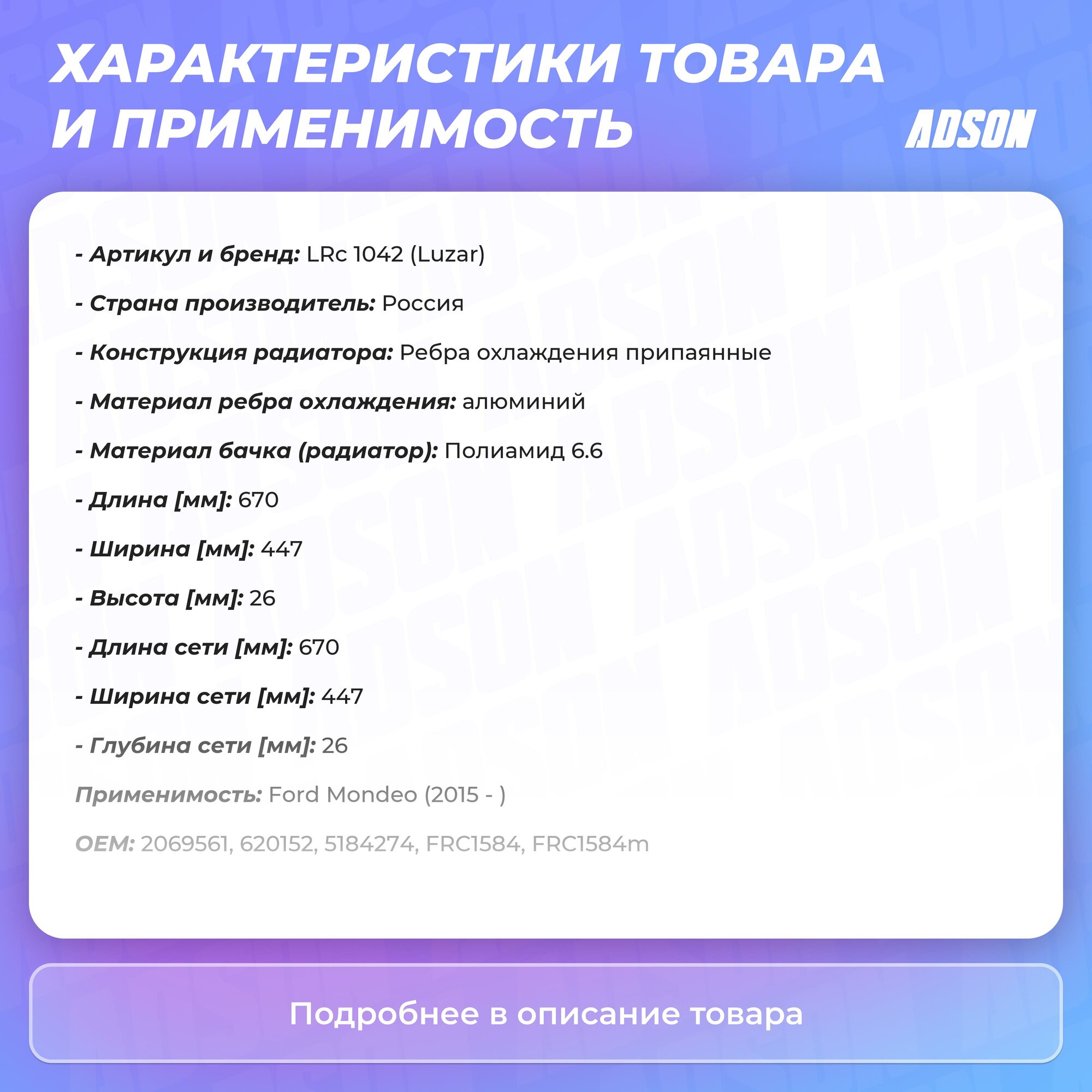 | Сопутствующий товар | Радиаторы кондиционера (конденсеры):LRAC 1042 |