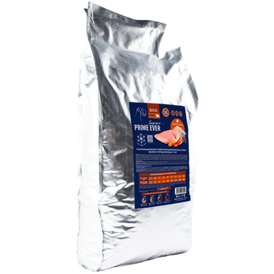Полнорационный сухой корм класса Superior для собак весом до 15 кг. Корм PRIME EVER Superior является суперпремиальным и полнорационным. Все корма данной линейки содержат Prime Synergy System - систему синергии натуральных компонентов, которая позволяет питомцу усвоить весь комплекс питательных веществ. Основная часть ингредиентов выращивается в чистейшем и красивейшем крае – на Алтае. Щадящая технология производства способствует максимальной сохранности питательных веществ и витаминов, корм лучше усваивается и заметно улучшается состояние кожи и шерсти питомца, а также всего здоровья в комплексе. Размер гранулы 9 мм.
