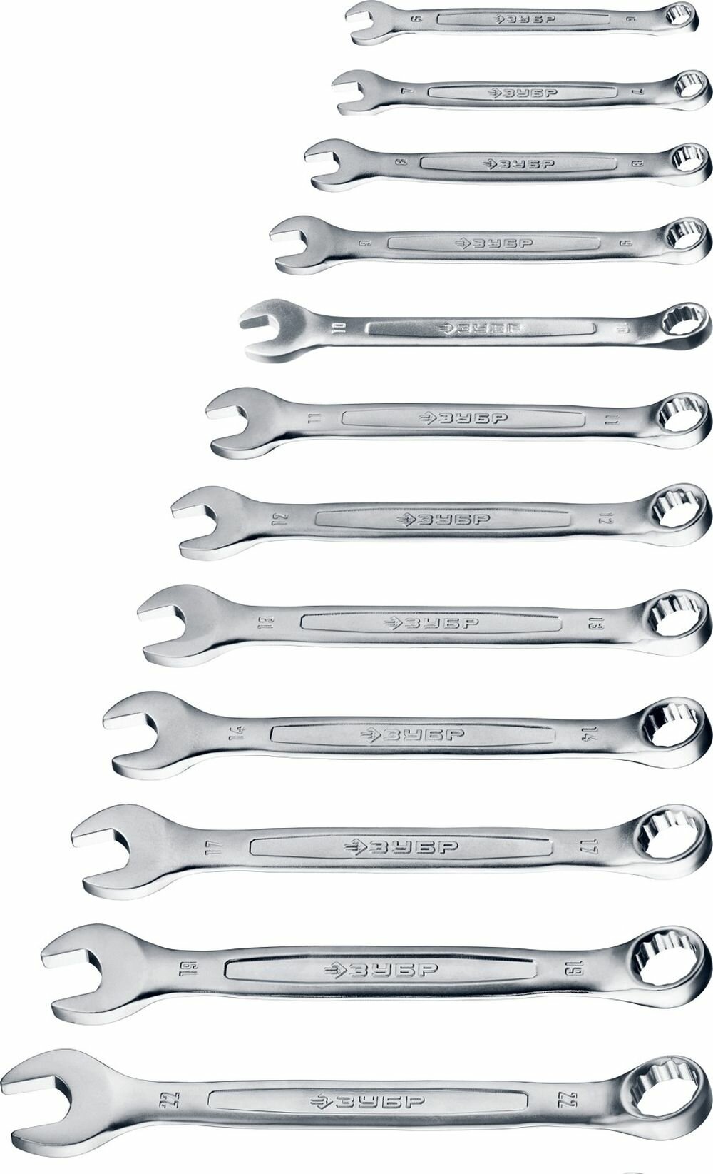 Материал ключей – хромованадиевая сталь. Хромированное покрытие для защиты от коррозии. Наборы комбинированных ключей ЗУБР предназначены для работы с шестигранным крепежом любой разновидности. Размер, мм: 6-22.