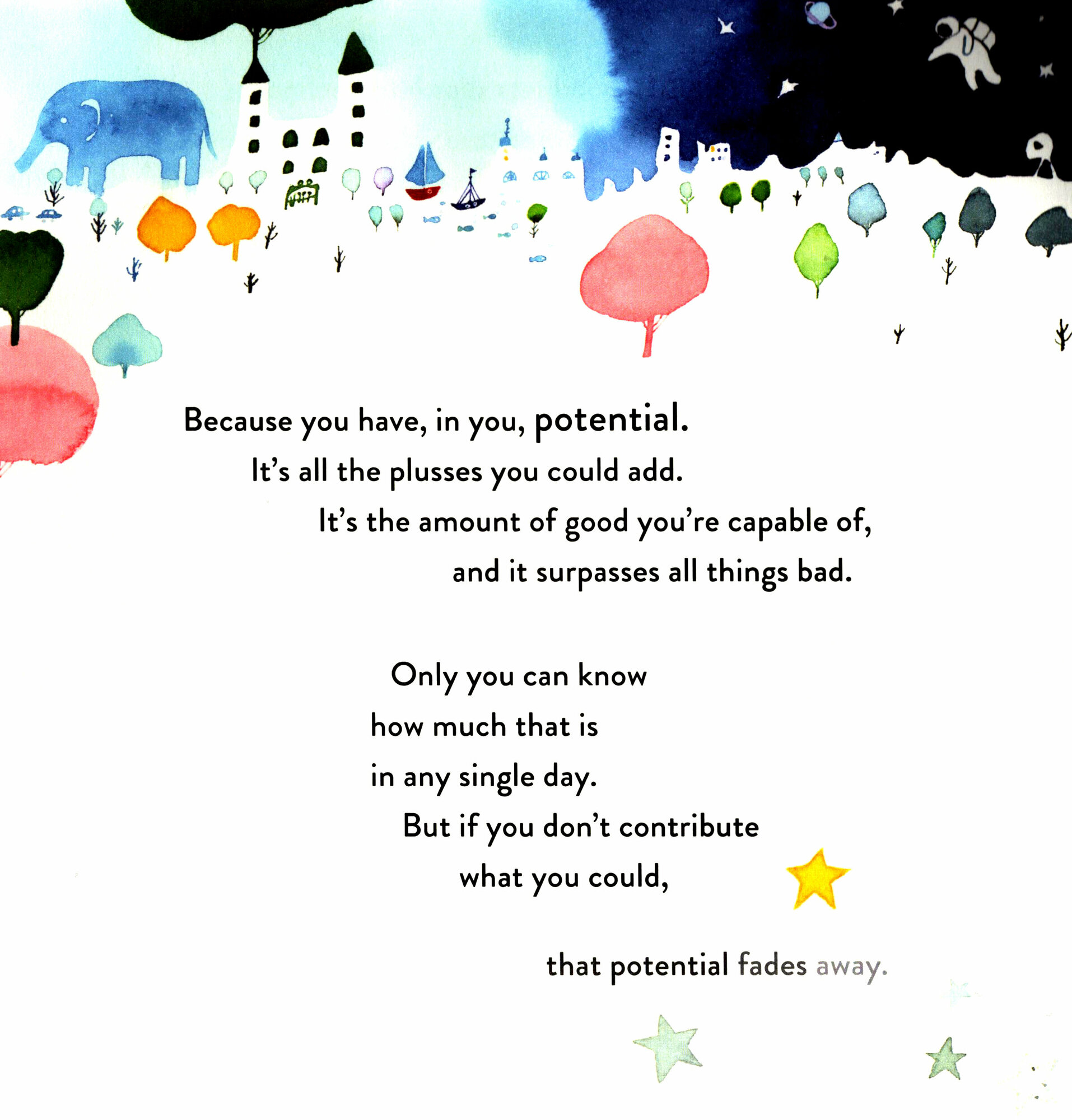 As one little boy lies in bed one morning, not wanting to face the day, it’s up to his older brother to show him the extraordinary potential within him and how even the smallest of his actions will make the world a better place . . .