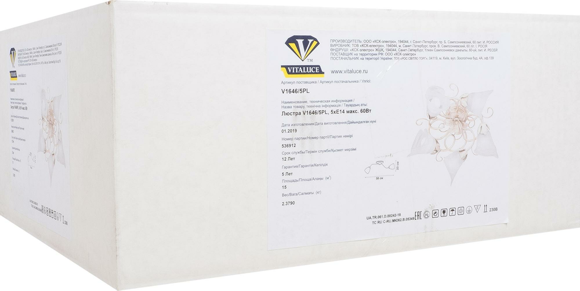 Люстра VITALUCE производства Россия имеет ширину 58 см и высоту 23 см. Модель выполнена в стиле флористика и великолепно впишется в обстановку аналогичных направлений. В утройстве используютя лампочки с цоколем E14. Основным материалом, применяемым в производстве люстры, является металл. Ведущий цвет - бежевый, золото