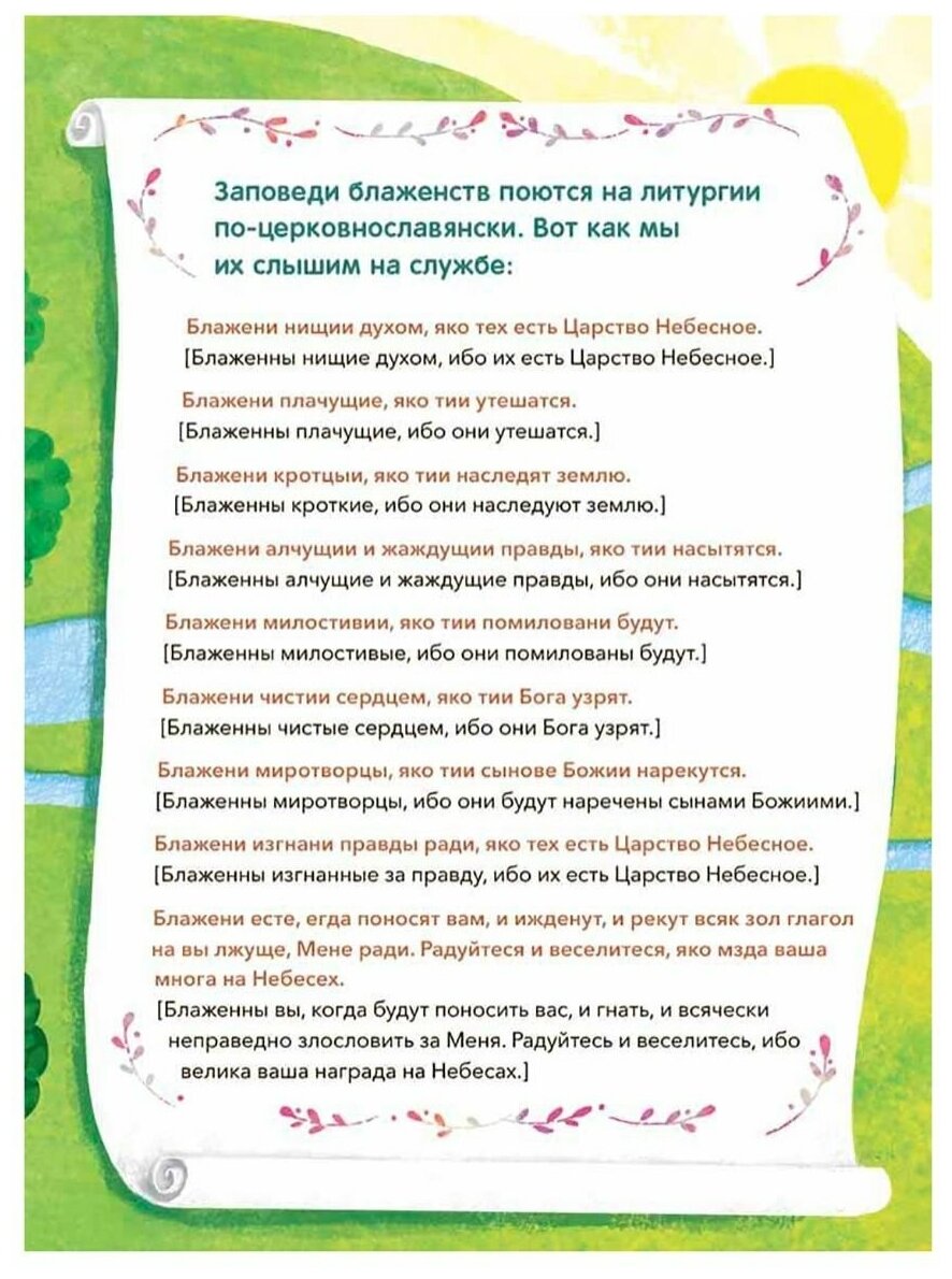Читая книгу вместе с ребёнком, вы узнаете о евангельских заповедях блаженств, которые можно услышать на каждой литургии.