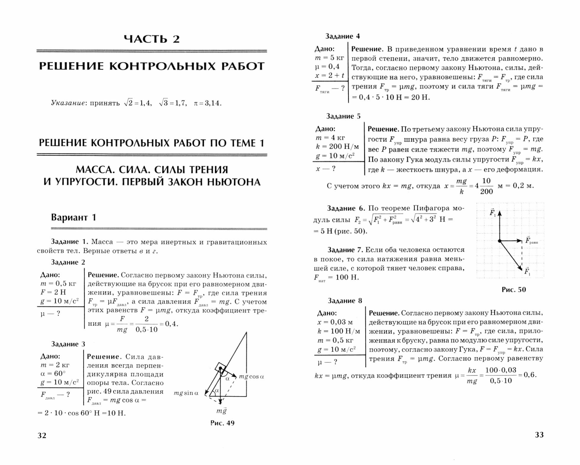 Каждая из тем этого раздела включает в себя 5 контрольных работ, состоящих из 10 заданий разного уровня трудности. Их содержание аналогично приведенным в Открытом банке заданий и используемым на ЕГЭ по физике. Если уроки по физике спаренные, как это имеет место в наукоемких лицеях и гимназиях естественно-научного профиля, то учитель может предлагать учащимся решить контрольную работу полностью, а на обычном 45-минутном уроке достаточно решения половины заданий по выбору учителя. Все задания соответствуют программе по физике для средней школы и способны надежно проверить уровень знаний старшеклассников.