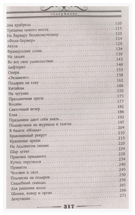 В очередном сборнике юмористических рассказов классика Н.А. Лейкина раскрываются типичные для того времени темы. Традиционные праздники и способы их отмечать, в том числе способы накрывать на стол за счет гостей, и угощение приютских сирот на господском празднике - конечно, о равноправном веселье не может быть и речи. Вездесущие купцы, безуспешно пытающиеся понять значение пьес, балета, цирковых представлений, принципы составления библиотеки (на вес или объем книг), архитектурные особенности городских новинок - фонтанов и мостов. Последние особенно настораживают: как бы чего не случилось, лучше поехать по льду, чем по мосту. И еще о страхах: до сих пор люди опасаются летать самолетами, а в конце XIX - начале XX века уже заранее оплакивали поднимающихся на воздушном шаре, попутчики же по железной дороге и вовсе не изменились. Так же жутковато и ночью на улицах, схожие увлекательные байки рассказывают о загранице, и настолько же похожи современные объявления о продаже на старинные - как и то, что ждет покупателей на месте. Зато радует, что отношение к труду художников медленно, но верно меняется к лучшему.