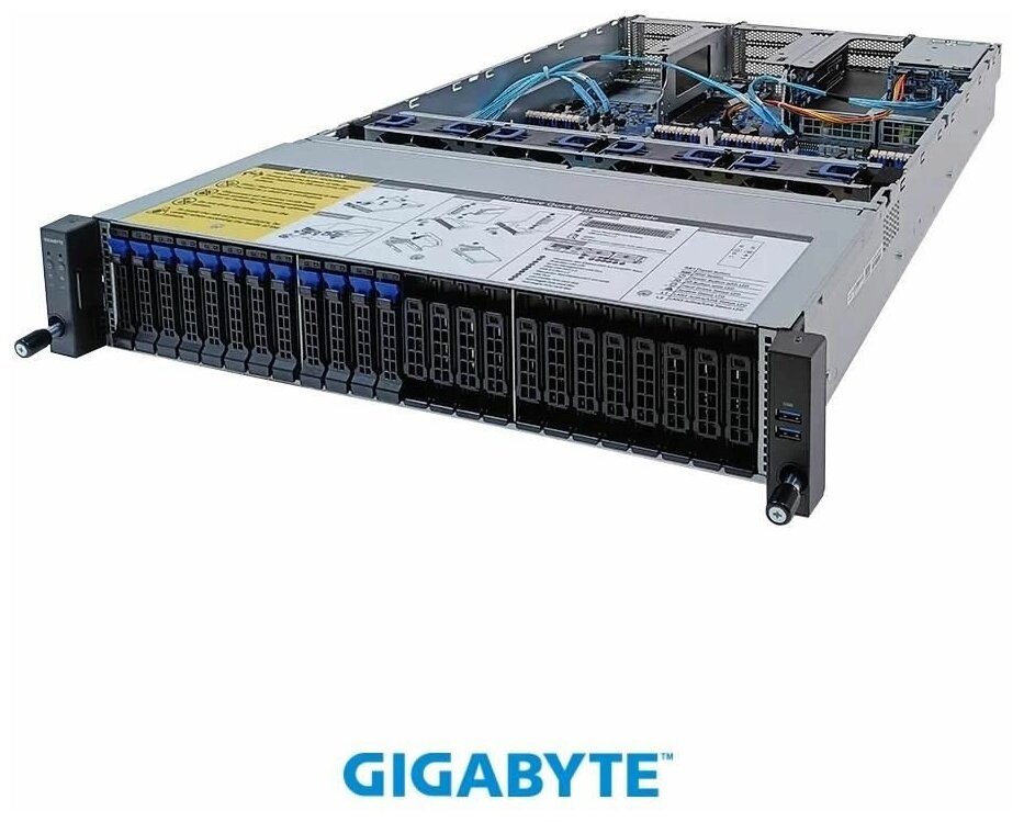 Серверная платформа Gigabyte R282-Z97, позволяет установить 2 процессора с разъемом SP3, 32 модуля памяти DIMM DDR4 и 12 дисков формата 2.5 с возможностью горячей замены, предустановлены 2 блока питания мощностью 1600 Вт.