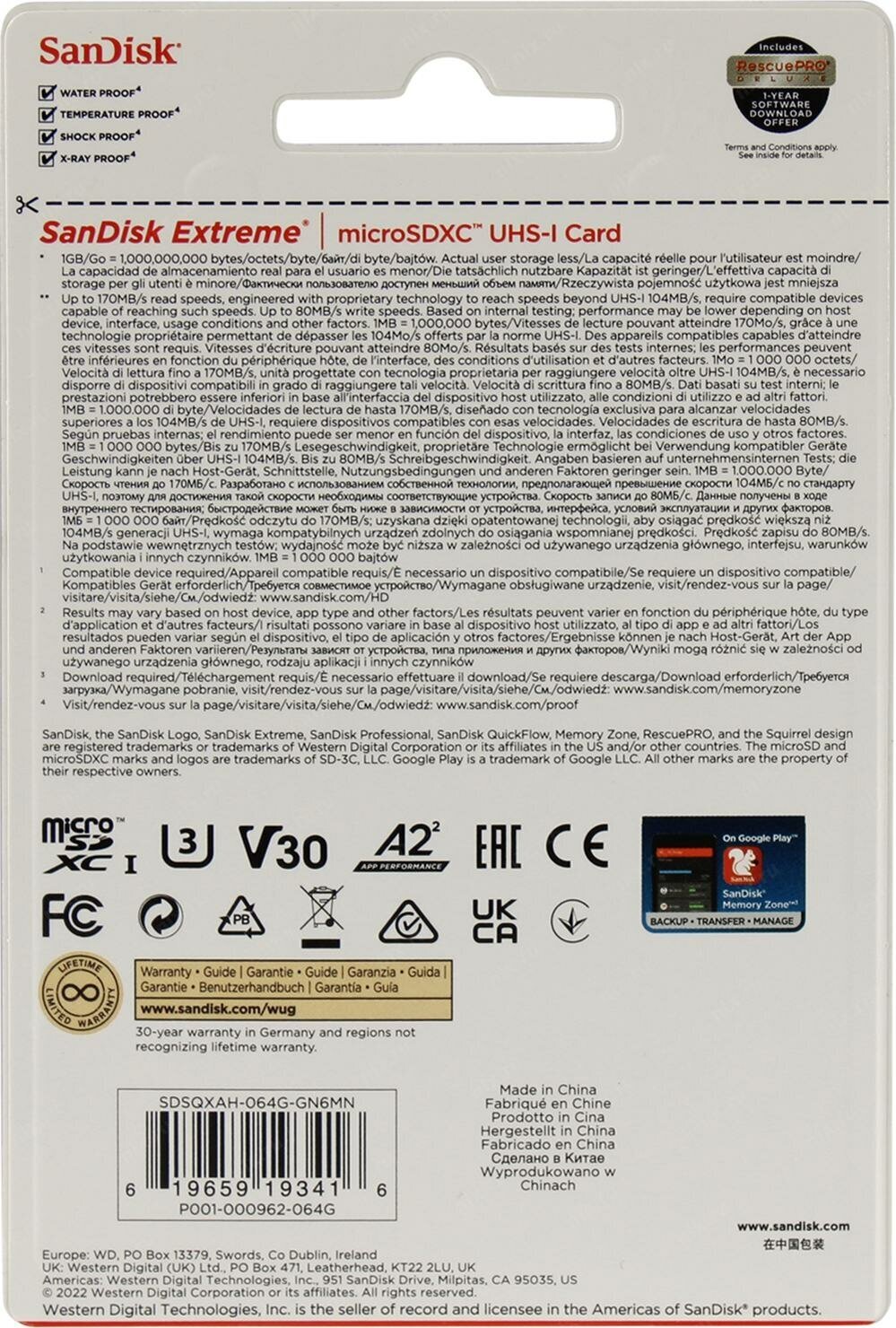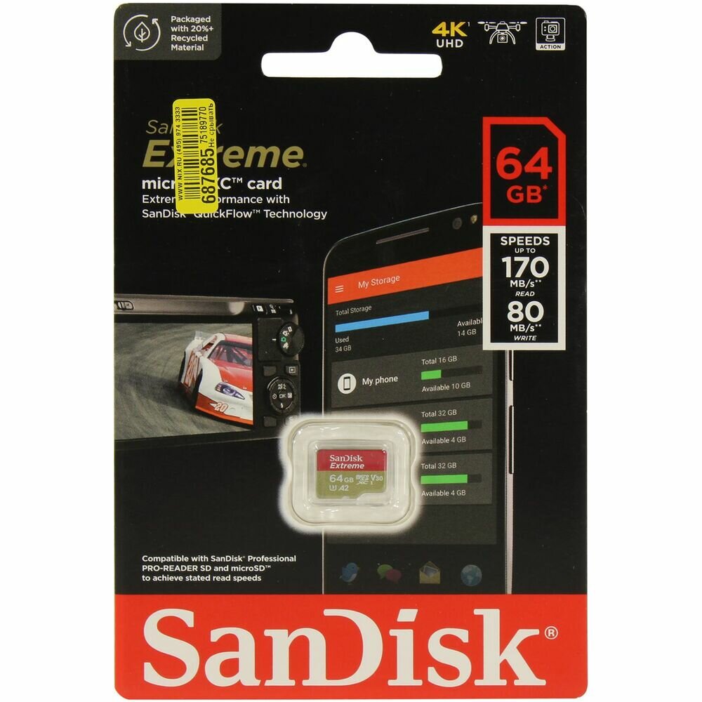 Карта памяти SanDisk Extreme microSDXC 64 ГБ обладает свойствами надежного запоминающего устройства, которое подходит для установки в смартфон, камеру, планшет и другие портативные устройства. Данная модель отличается емкостью 64 ГБ, позволяя хранить весьма большое количество различных файлов. Скорость в пределах 170 Мбайт/с обеспечивает высокую производительность при обмене и записи данных. Прочная конструкция SanDisk Extreme гарантирует надежную защиту файлов от воздействия влаги, пыли и других неблагоприятных факторов внешней среды.
