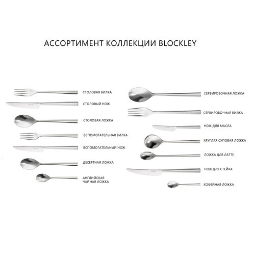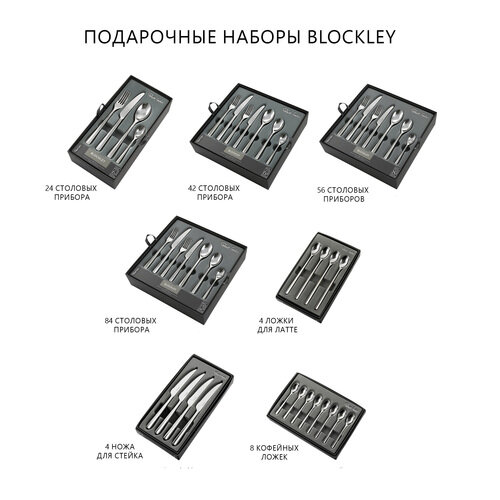 | Состав набора | BLOBR1001L - 6 столовых ножей 24 см; BLOBR1002L - 6 столовых вилок 21,2 см; BLOBR1003L - 6 суповых ложек 21,2 см; BLOBR1007L - 6 чайных ложек 14 см |