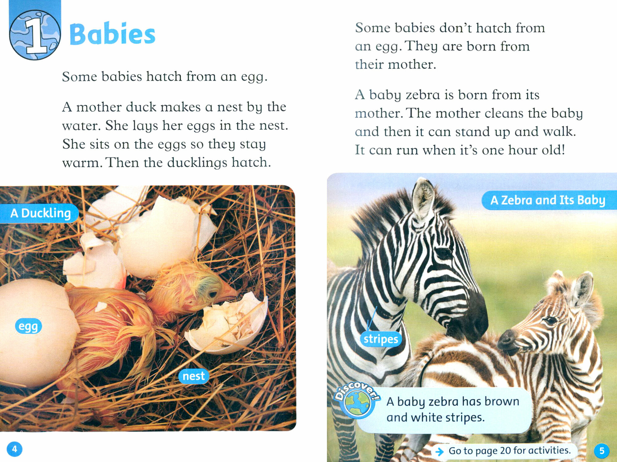 Read and discover all about young animals. What colour are baby zebras? Where do young bears live?