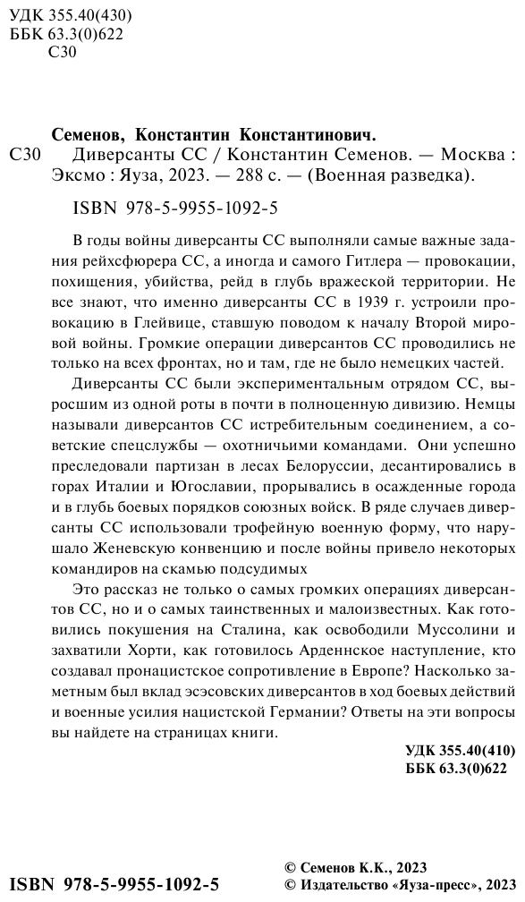 Книга: Диверсанты СС (Константин Константинович Семенов); Яуза-пресс ООО, 2022